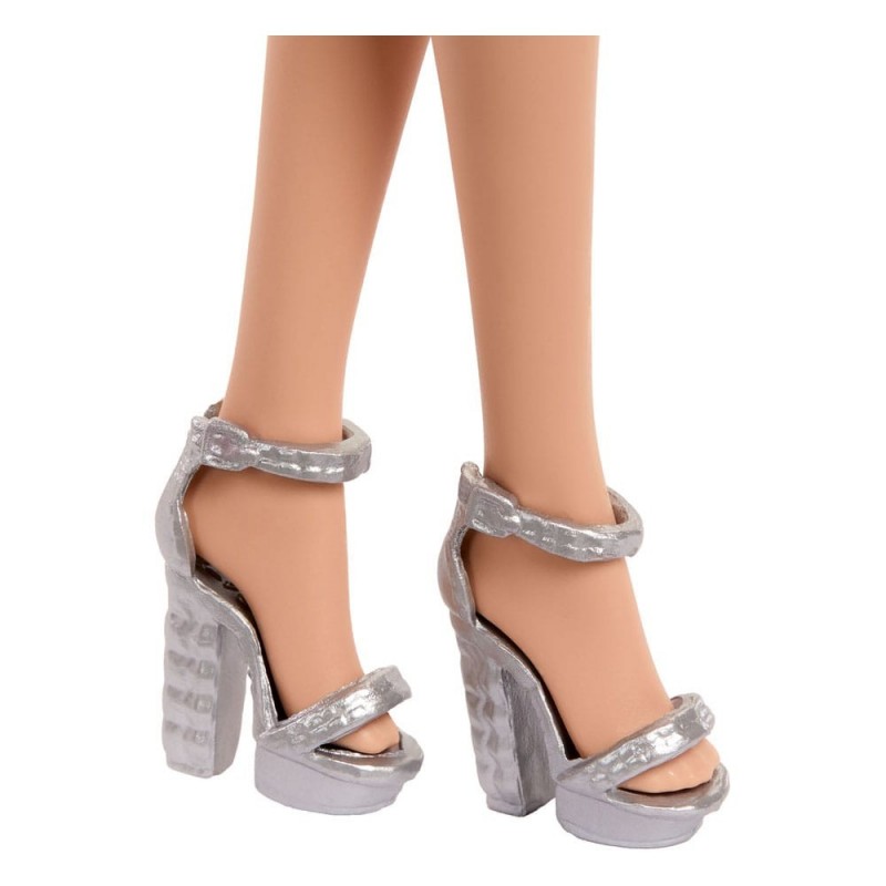 El vestido cuenta con un diseño sin tirantes y un acabado en encaje en la parte superior que complementa su figura icónica. Los zapatos de tacón plateados añaden un toque moderno y glamuroso, mientras que el collar en su cuello exhibe un diseño simbólico de celebración.