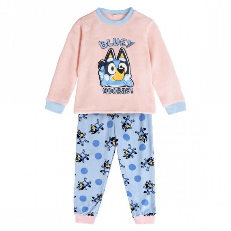 El conjunto incluye una camiseta de manga larga en un encantador color rosa pastel, adornada con una impresión de Bluey y el texto 'Hooray!', que hará las delicias de los pequeños seguidores del personaje. Los pantalones, en un vibrante azul, están decorados con un patrón de Bluey en diferentes posiciones, destacando sobre un fondo de lunares grandes, lo que añade un toque alegre y juguetón.