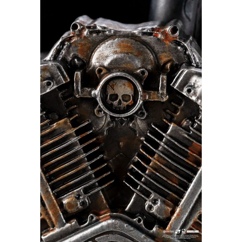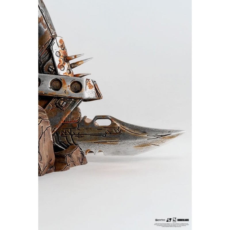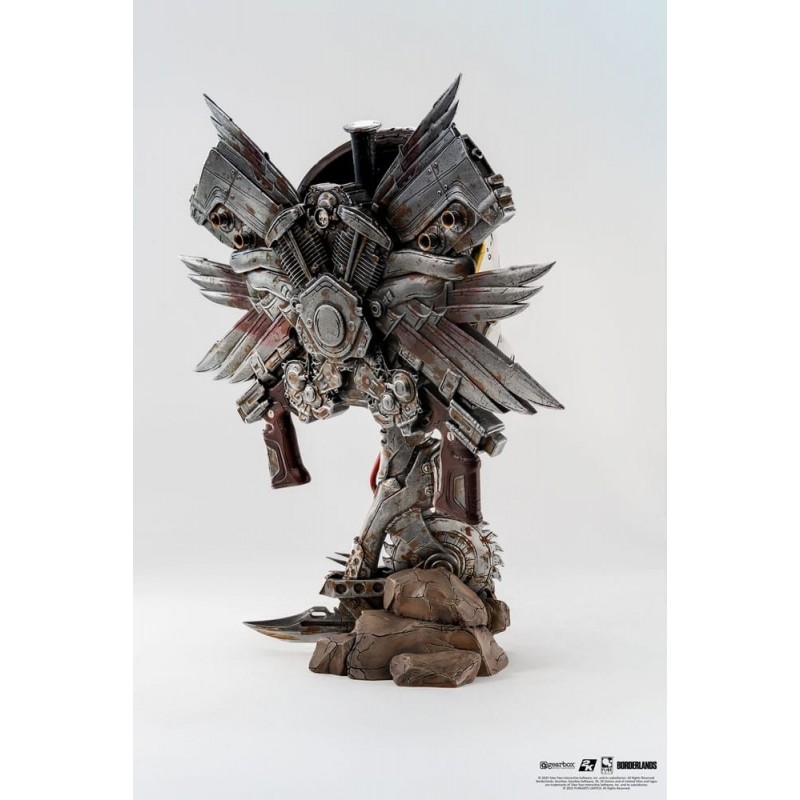 Con unas dimensiones aproximadas de 46 cm, esta pieza está limitada a solo 1250 unidades globalmente, lo que la convierte en un objeto valioso para cualquier fanático de los videojuegos. El soporte presenta detalles mecánicos que complementan el estilo único de Borderlands.