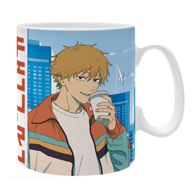 Descubre esta taza de 460 ml inspirada en el mundo de Chainsaw Man. Con un diseño vibrante, presenta a los queridos personajes Denji y Pochita sobre un fondo de ciudad azul brillante, un día normal como el que tanto desearían este par.