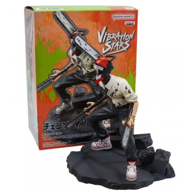 La figura Chainsaw Man Vibration Stars de Banpresto captura a la perfección al icónico personaje del popular manga y anime. El Hombre Sierra se presenta en una pose dinámica, destacando por su camiseta blanca manchada de sangre y pantalones oscuros. Mide 14 cm de altura y está hecha en PVC de alta calidad. Incluye una base para exposición que simula un terreno rocoso, perfecta para mostrarla con orgullo en tu colección.