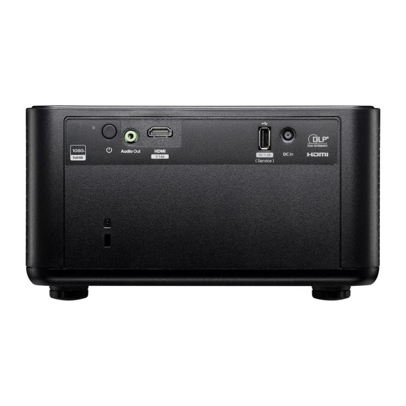 En la parte posterior, el proyector está equipado con múltiples puertos, incluyendo HDMI y salida de audio, facilitando la conexión con diversos dispositivos. Su mando a distancia, también en negro, es ergonómico y cuenta con botones claramente identificados para un control fácil y cómodo.