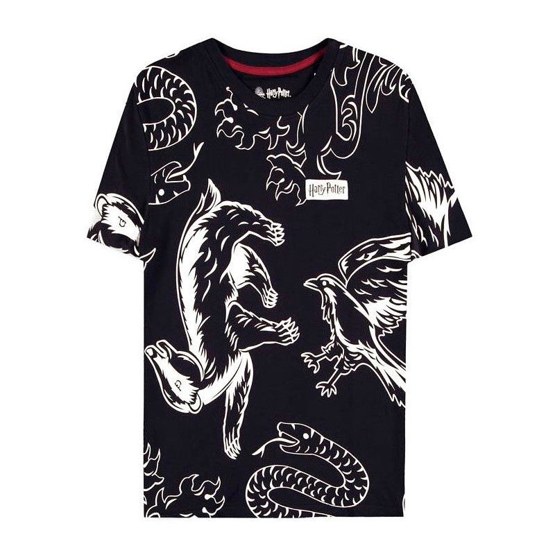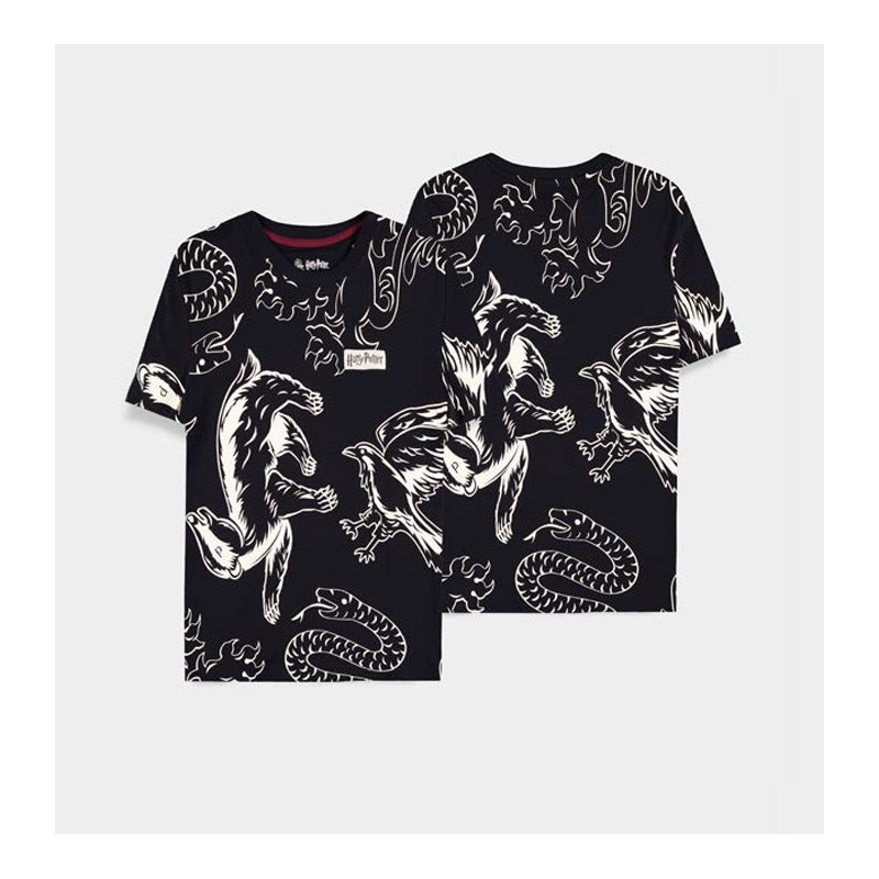 Se trata de una camiseta oficial de gran calidad y fabricada en algodón 100% con una excepcional calidad en material, gráficos y acabados. Pero lo mejor es su fantástico diseño, con un preciosos dibujos blancos sobre el elegante fondo negro de la camiseta. Los dibujos están realizados en trazo blanco y representan los animales icónicos de cada una de las casas de Hogwarts: Gryffindor, Slytherin, Huffelpuff y Raveclaw. Está diseñada con un corte moderno especial para chica para que quede muy bien.