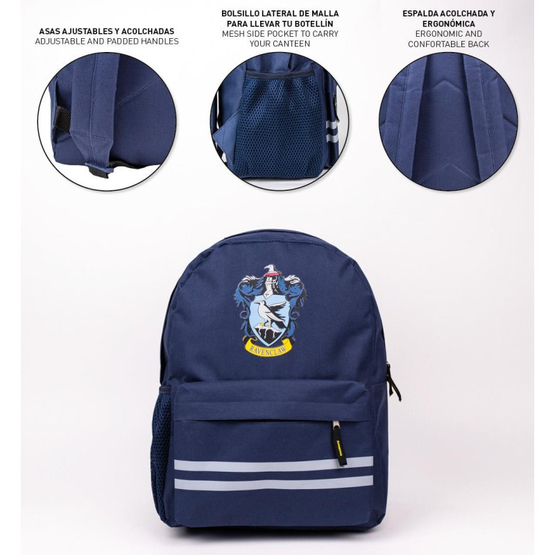 Mide aproximadamente 30 x 41 x 14 cm, por lo que podrás llevar en el casi cualquier cosa que se te ocurra, varitas y pociones mágicas varias incluidas. Cuenta con dos prácticas y resistente asas ajustables, bolsillo lateral de malla, espalda acoclchada, y su diseño es todo un homenaje a la Casa Ravenclaw, una de las cuatro que integran el colegio Hogwarts, al que pertenecen personajes tan míticos como Luna Lovegood.