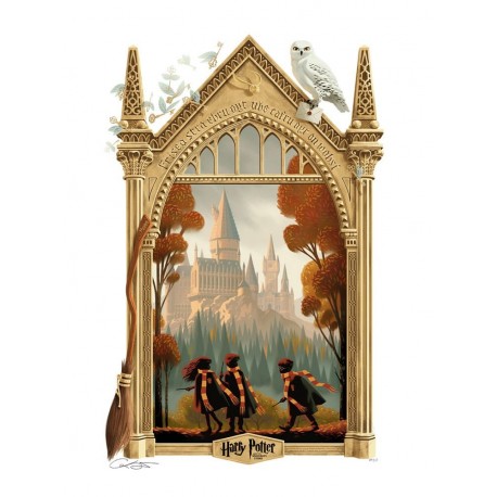 Descubre una pieza única para los verdaderos aficionados de Harry Potter con esta litografía de edición limitada de Sideshow Collectibles. La ilustración presenta un diseño elegante y detallado, evocando el mágico mundo del joven mago. En el centro, destaca el majestuoso castillo de Hogwarts rodeado de árboles en tonos otoñales, con tres figuras caminando hacia la icónica escuela de magia. El marco gótico dorado, coronado con una lechuza blanca, añade un toque de autenticidad y nostalgia.