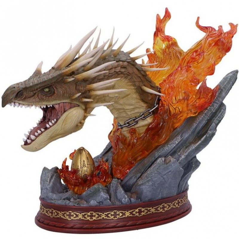 El diseño captura el ferocidad del dragón con una expresión amenazante y una postura que emana poderío, complementada por unas llamas vibrantes que emergen de la base rocosa, simulando un escenario épico. Además, el huevo dorado, elemento crucial en el Torneo de los Tres Magos, está representado con finos detalles grabados.