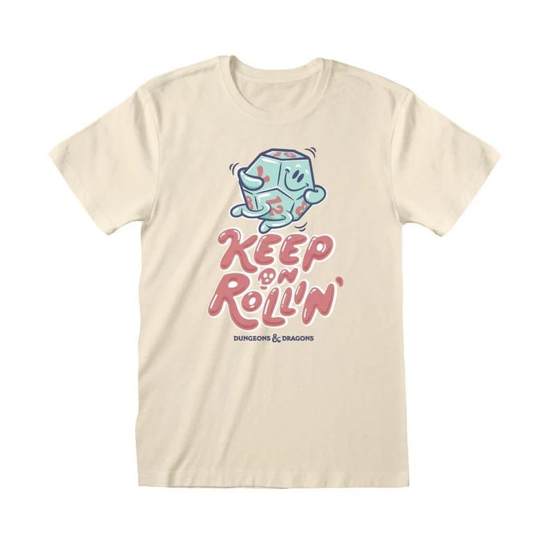 Descubre la camiseta Keep On Rolling de Dungeons & Dragons, perfecta para los verdaderos fans del juego. Esta camiseta presenta un diseño divertido con un dado sonriente y el lema 'Keep On Roll'n' en tonos pastel. Confeccionada en 100% algodón, asegura comodidad y durabilidad.