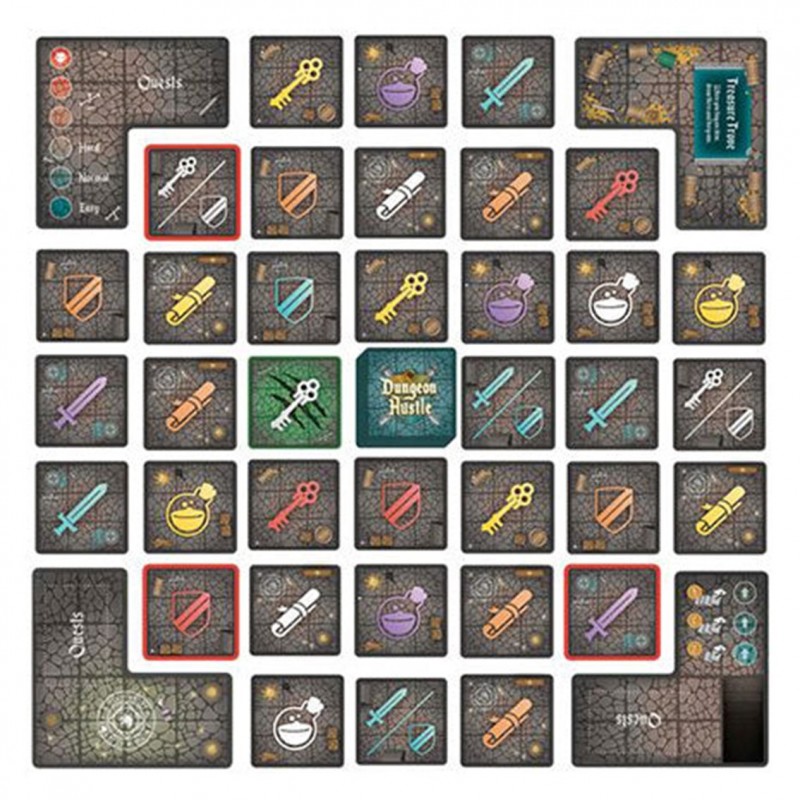 El juego incluye una variedad de componentes: 96 losetas de mazmorra, 20 cartas de misión, fichas de personajes y monstruos, cartas de objetos y poderes de apoyo. La dinámica del juego se desarrolla en una matriz de 7x7, lo que crea un entorno único en cada partida. Las reglas son fáciles de seguir, permitiendo que nuevos jugadores se integren rápidamente.