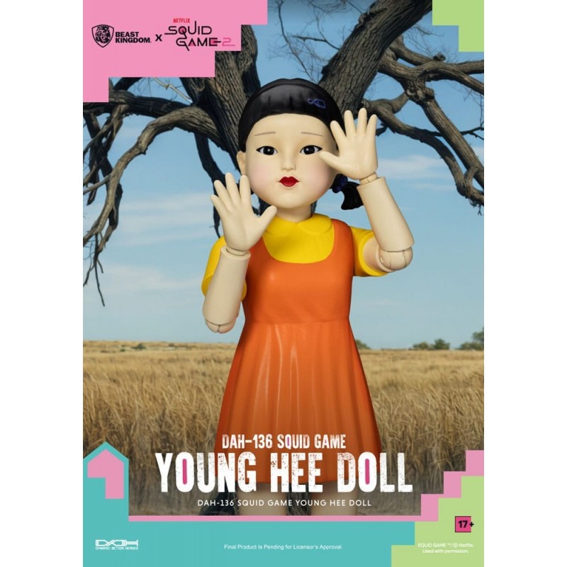 La figura articulada Young Hee Doll de 30 cm, de la famosa serie "Squid Game", es un producto con licencia oficial diseñado por Beast Kingdom Toys. Esta figura es fiel al personaje icónico, con su característico vestido naranja y camiseta amarilla. Con detalles precisos y sonido incorporado, esta figura es ideal para los fanáticos de la serie. Además, viene con accesorios adicionales que mejoran la experiencia de juego o exposición.