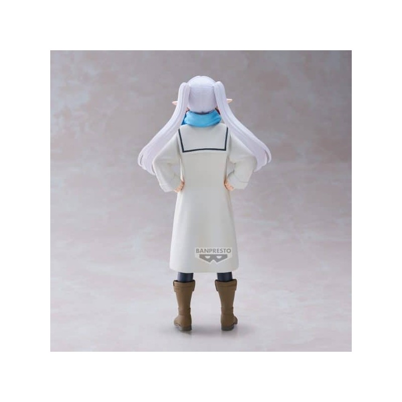 Esta figura está meticulosamente esculpida para representar la nobleza y tranquilidad de Frieren. Desde su expresión facial hasta los pliegues de su vestimenta, cada elemento refleja una ejecución de alta calidad propia de los productos oficiales Banpresto.