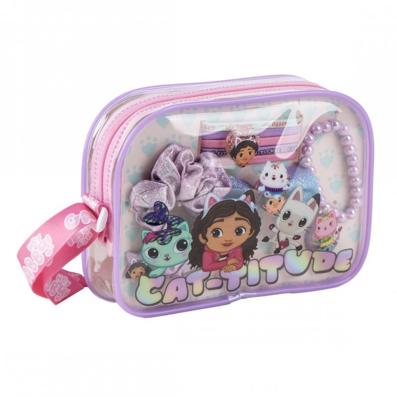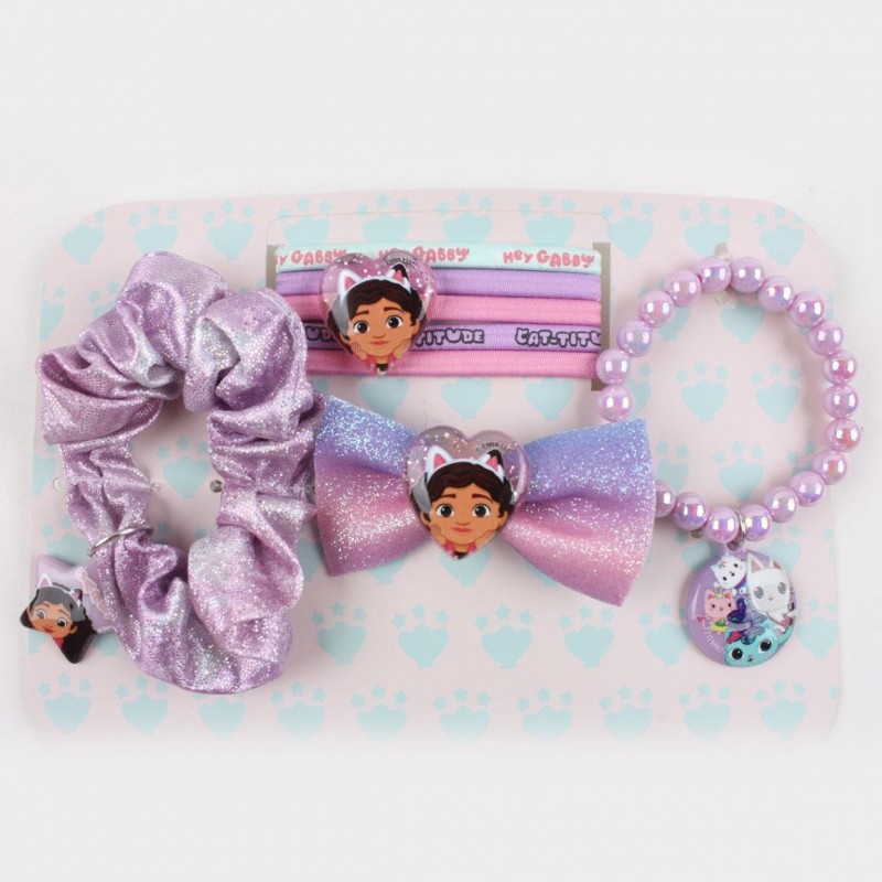 En su interior, encontrarás coleteros y diademas con diseños exclusivos de personajes como Gabby, decorados con detalles brillantes que añadirán un toque especial a cualquier peinado. Además, incluye una pulsera de cuentas en tonos rosados, perfecta para complementar cualquier atuendo. Todo viene cuidadosamente guardado en un bolsito transparente con cierre, decorado con imágenes de Gabby y sus amigos, facilitando el transporte y almacenamiento de los accesorios.