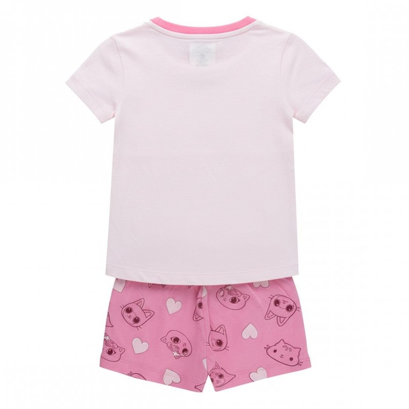 La camiseta presenta a Gabby y su amigo gatuno con la frase 'A-meow-zing Friends', destacando en un alegre color rosa que encantará a los niños. Los pantalones cortos, en un tono rosa más oscuro, están decorados con simpáticos gatitos y corazones, añadiendo un toque de diversión.