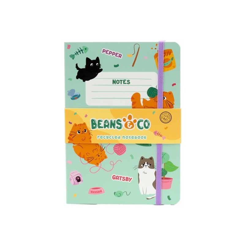 Este encantador cuaderno de papel reciclado de Beans & Co es perfecto para los amantes de los gatos. De tamaño aproximado A5 (14 cm x 21 cm), su portada está adornada con adorable ilustraciones de gatitos en diversas poses, cada uno de un color distinto. La combinación de colores suaves y el diseño travieso lo hacen un regalo ideal.