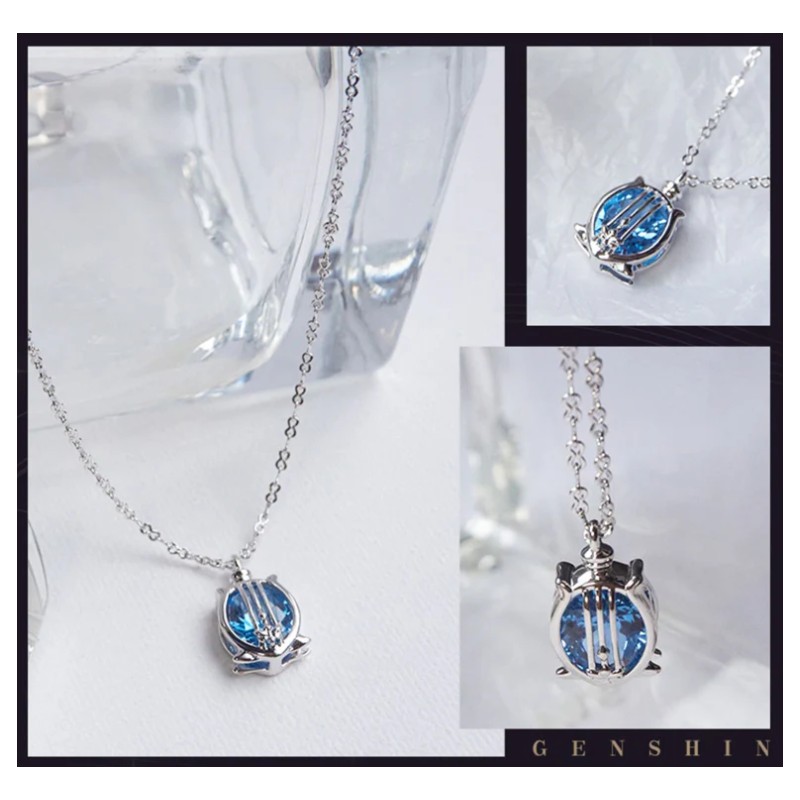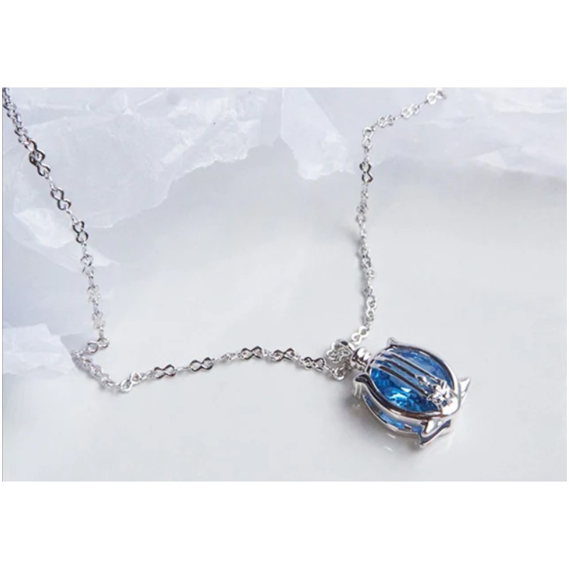 Este elegante collar forma parte de la exclusiva colección Genshin Concert 2021 Wonderers Troupe Series. El colgante muestra un diseño inspirado en una lira, destacando un brillante tono azul gracias a las circonitas incrustadas. Hecho de cobre chapado en platino, el collar mide alrededor de 420mm de longitud, mientras que el dije tiene dimensiones aproximadas de 17.5mm por 10mm. Un accesorio perfecto para los admiradores de Genshin Impact que buscan añadir un toque distintivo a su colección.