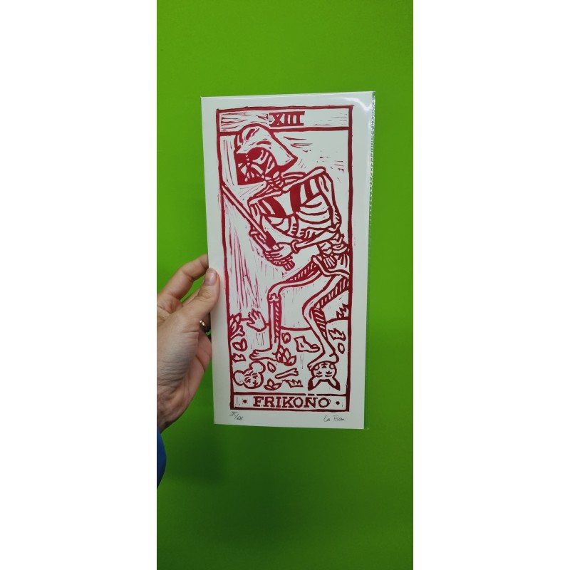Tiene unas medidas de 29,7x 14,5cm aprox, está hecho en tinta rojo sangre y papel buenísimo y ha sido la base para el cartel de la edición del FRIKOÑO de 2025.
