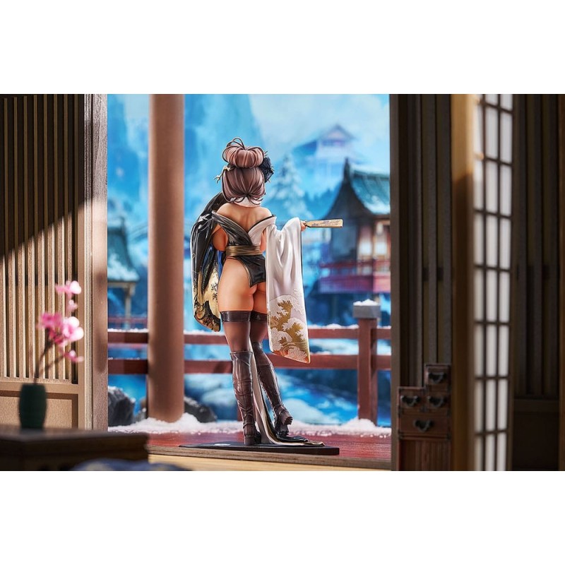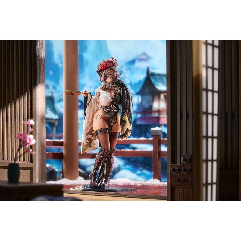 La figura presenta a Noir con un atuendo llamativo y detallado, adornado con flores en el cabello y un abanico en la mano, resaltando su estilo único. La base decorativa y los accesorios incluidos completan esta obra de arte.