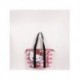 El diseño presenta un vibrante rosa con rayas horizontales y la icónica imagen de Hello Kitty en el centro, luciendo su característico lazo rojo. Las asas negras aportan un contraste elegante y son lo suficientemente largas para llevarla cómodamente al hombro. Cuenta con un cierre de cremallera en la parte superior, asegurando que tus pertenencias estén seguras durante el transporte.