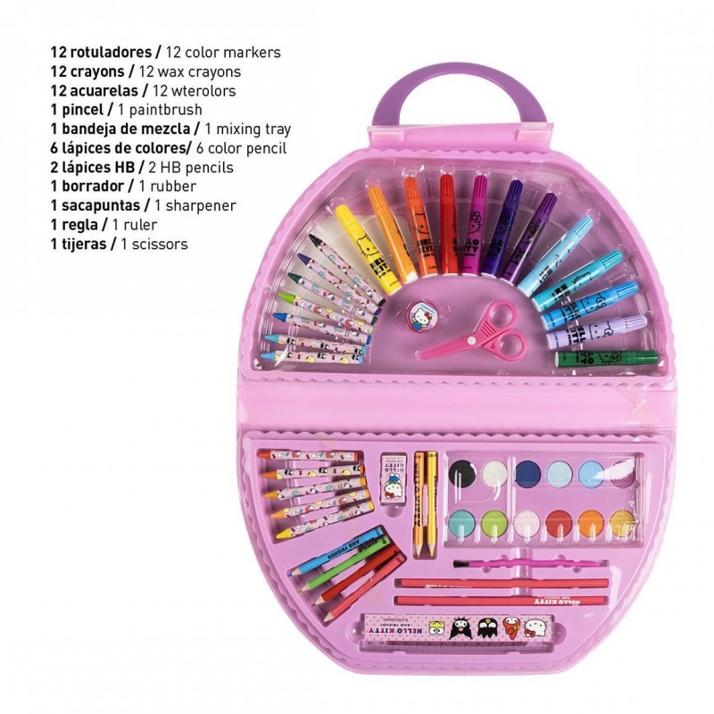 Incluye 12 rotuladores de colores vivos, 12 crayones de cera, y 12 acuarelas perfectas para dar vida a cualquier dibujo. Además, encontrarás un pincel, una bandeja de mezcla y seis lápices de colores. Completa el set con dos lápices HB, un borrador, un sacapuntas, una regla y unas tijeras, todo con diseños exclusivos de Hello Kitty y sus amigos.