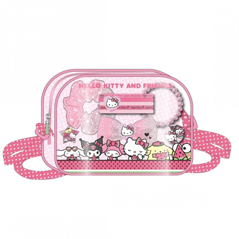 El set contiene un lazo brillante, una scrunchie, una pulsera de cuentas y varias pinzas para el pelo, todos en tonos rosados y decorados con la adorable imagen de Hello Kitty. El bolsito tiene un diseño transparente que permite ver el contenido fácilmente, perfecto para usar en viajes o para jugar en casa. Los materiales son de alta calidad para asegurar durabilidad y comodidad en el uso diario.