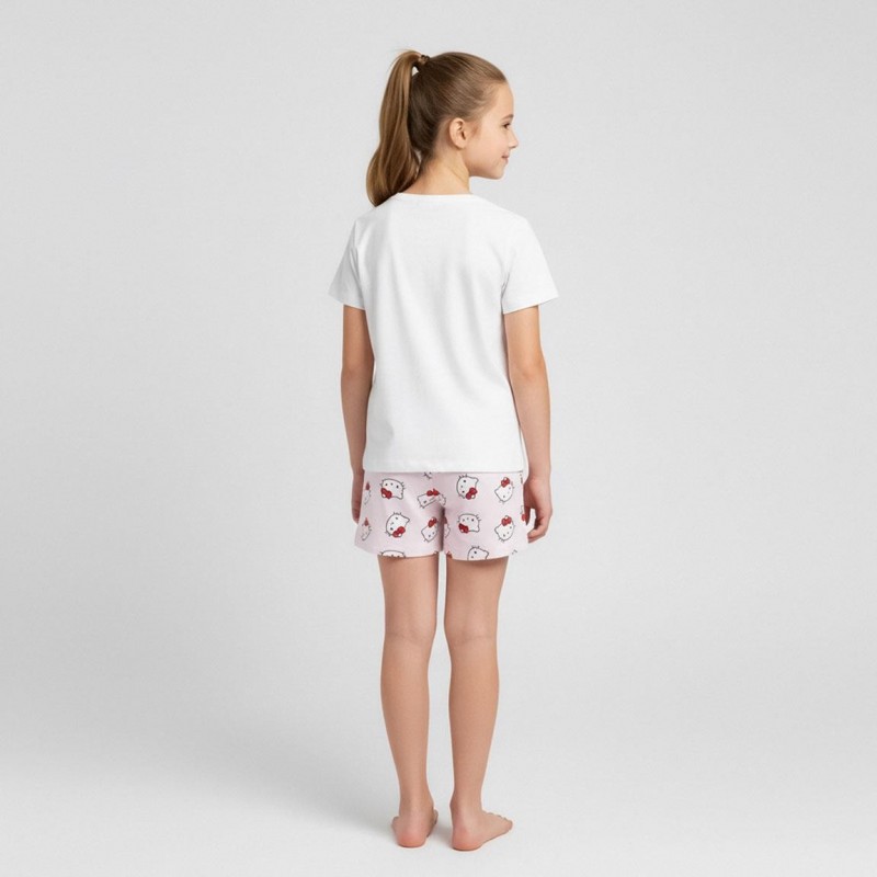 Este encantador pijama corto de Hello Kitty está diseñado para brindar comodidad y estilo a las pequeñas fans de 6 a 12 años. Confeccionado en 100% algodón, garantiza suavidad y frescura durante las noches de verano. El conjunto incluye una camiseta blanca con un colorido estampado de Hello Kitty y sus amigos, y un pantalón corto en tono rosa claro adornado con el característico lazo rojo de Kitty.