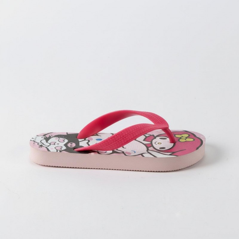 El diseño es colorido y atractivo, presentando a personajes icónicos de Sanrio como Hello Kitty y sus amigos. Los colores predominantes son el rosa y el blanco, con correas rosas que añaden un toque vibrante. La suela texturizada garantiza una tracción segura, ideal para evitar resbalones tanto en piscina como en la playa.
