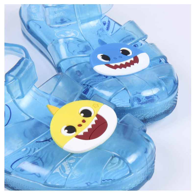 Su diseño transparente esta genial, con dos tonos de azul muy bonitos, dos dibujos tiburones de cada color en cada sandalia y un estampado en las plantillas.