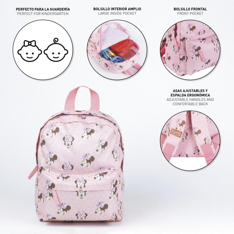 La Mochila Guardería Minnie Bebé es un producto de alta calidad diseñado especialmente para satisfacer las necesidades de los pequeños fans de Minnie. Con un elegante color rosa, esta mochila está compuesta al 100% de poliéster, lo que garantiza una durabilidad y resistencia excepcionales.
