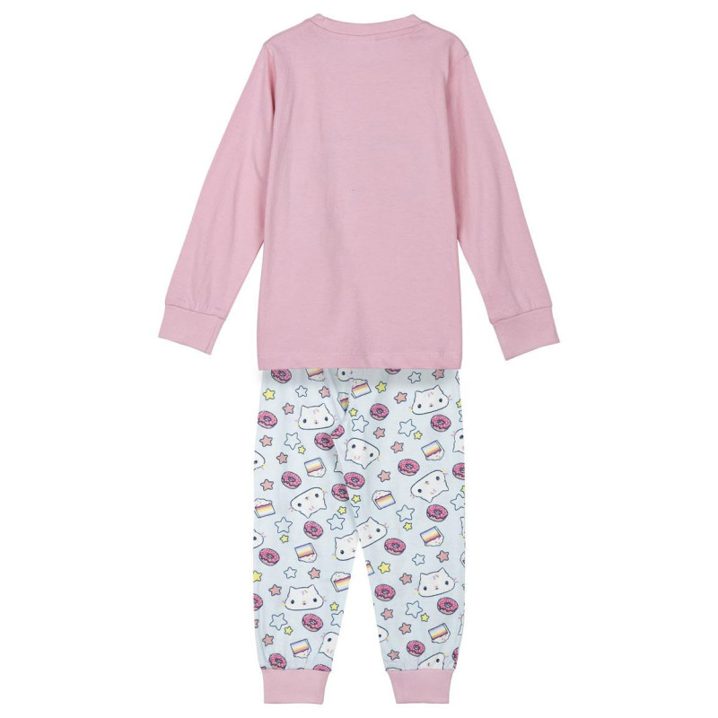 El diseño del pijama es encantador y colorido. La camiseta es de color rosa suave con un estampado alegre del personaje de Gabby's Dollhouse junto con sus adorables amigos, rodeado de donuts y estrellas, lo que seguramente encantará a los más pequeños. Los pantalones presentan un fondo blanco con diseños repetidos de donuts, estrellas y personajes de la serie, resaltando con tonos pastel.