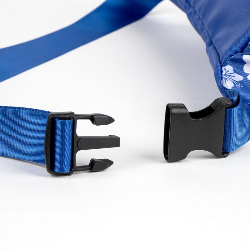 La correa ajustable, diseñada en un azul a juego con detalles en rosa, asegura comodidad y versatilidad, permitiendo llevarla alrededor de la cintura o cruzada sobre el cuerpo según tus necesidades. El cierre de hebilla es robusto y fácil de usar, asegurando que tu riñonera permanezca en su lugar.