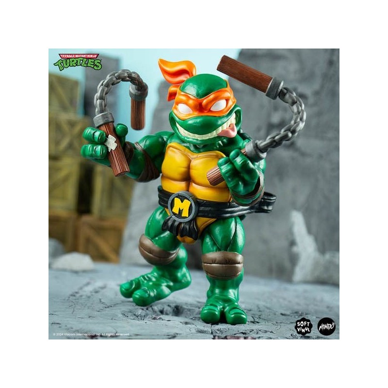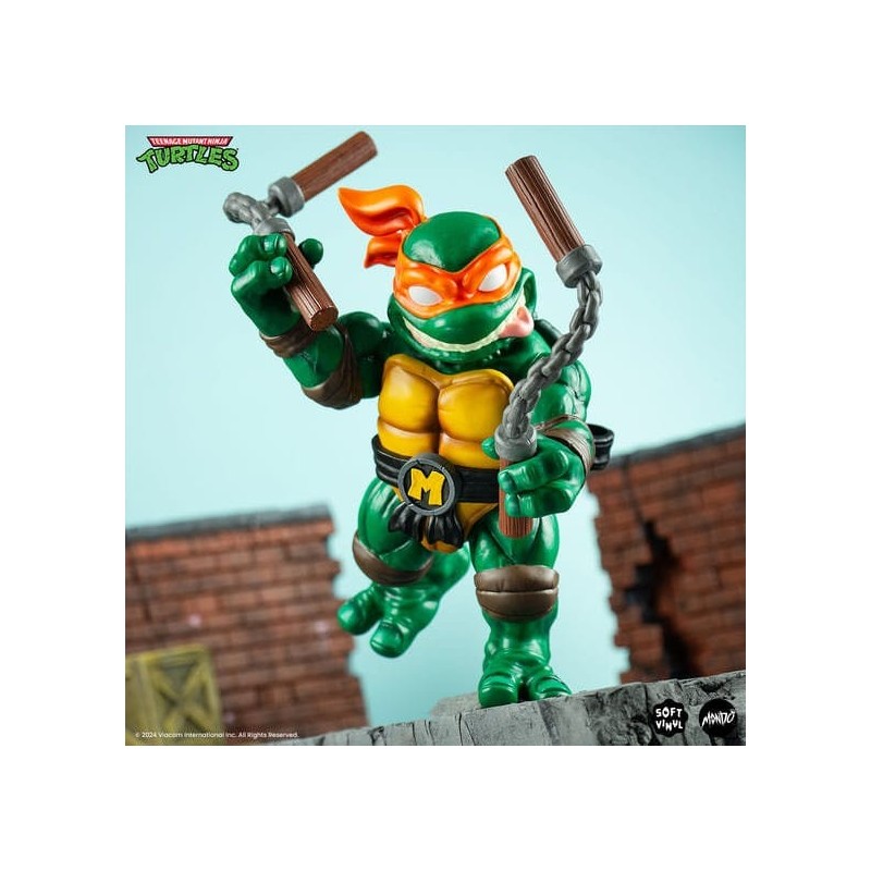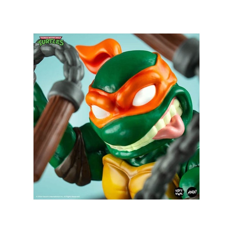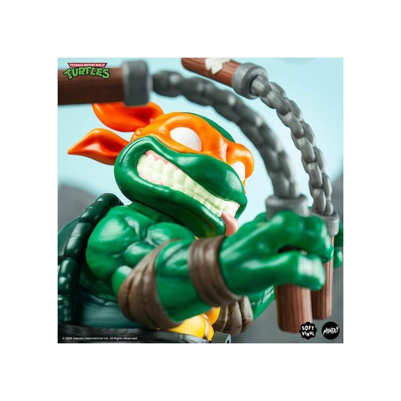La figura de Michelangelo de las Tortugas Ninja es un impresionante coleccionable de vinilo suave, con un tamaño aproximado de 20 cm. Destaca por su acabado detallado, representando al carismático personaje con su inconfundible antifaz naranja y su característica sonrisa despreocupada. Equipado con sus fieles nunchakus, esta figura se convierte en una auténtica pieza de exhibición para los amantes de la saga.