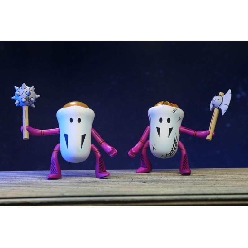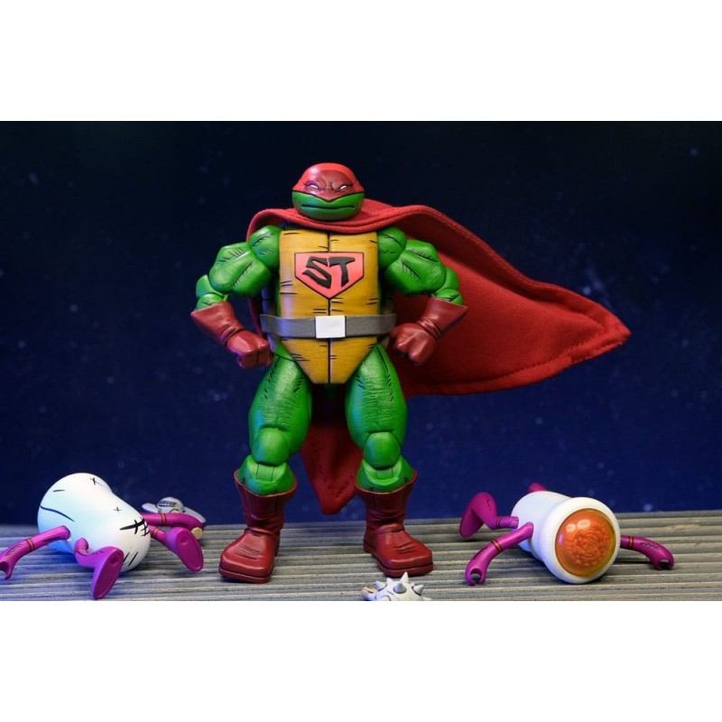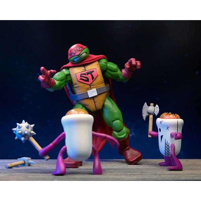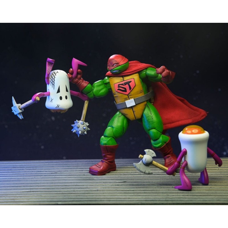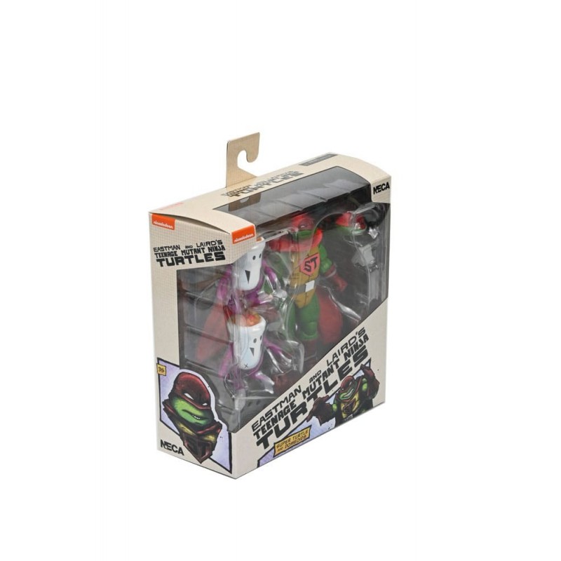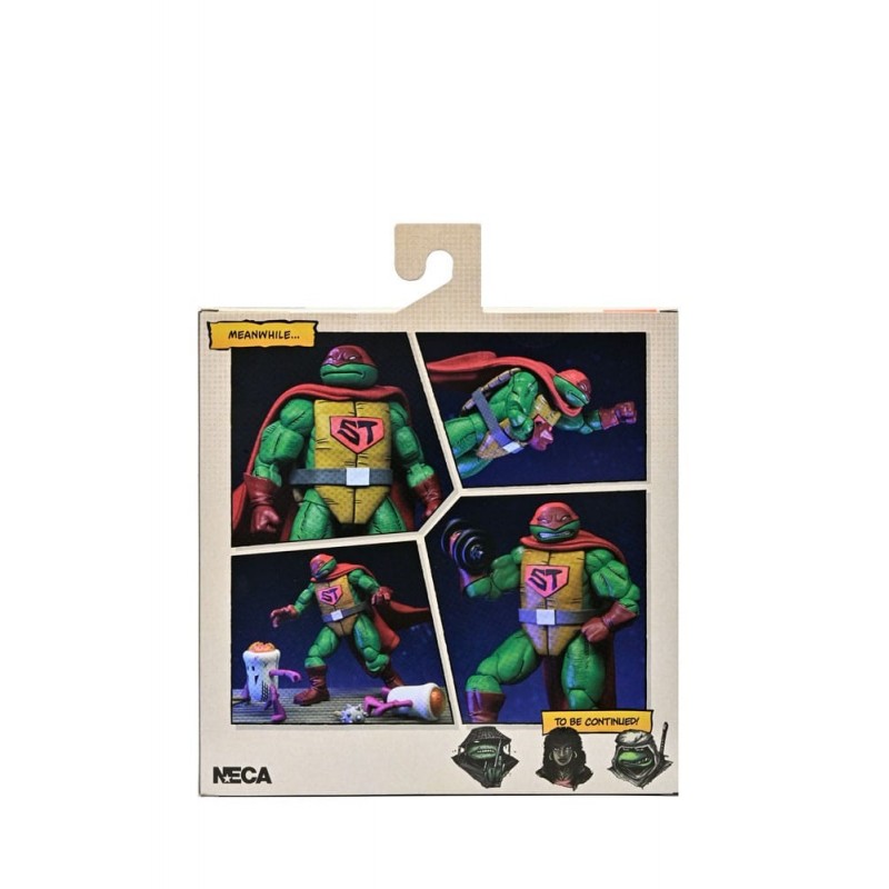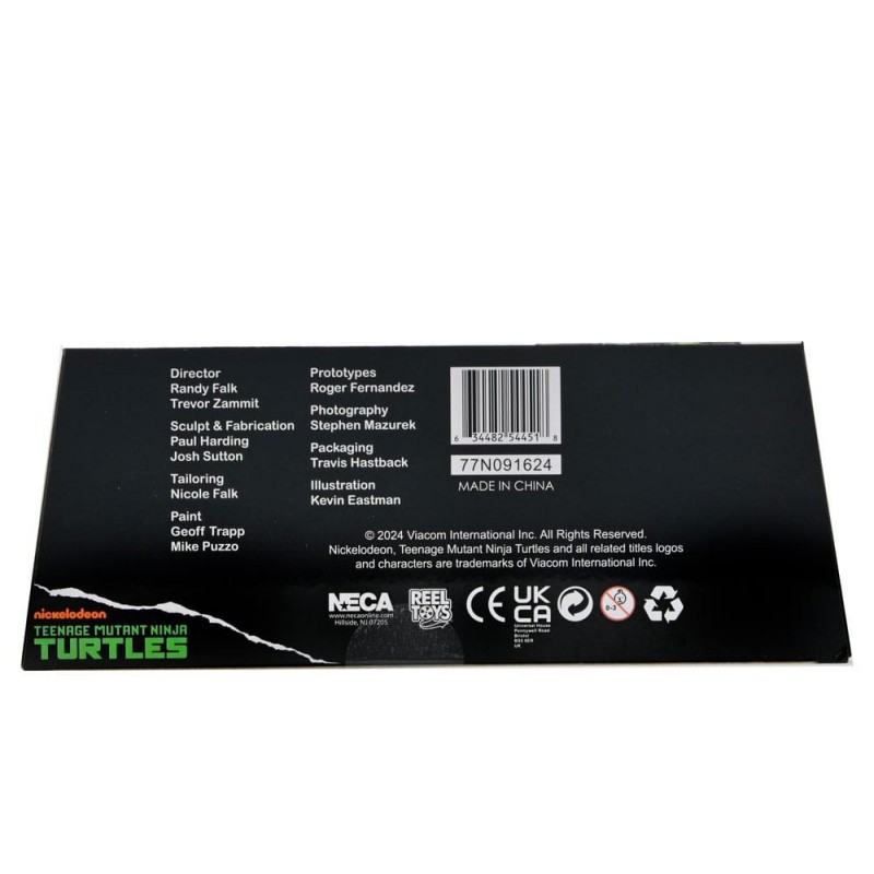 Fabricada por NECA, se presenta en una caja con ventana que permite ver todos sus accesorios, incluyendo cabezas intercambiables, manos adicionales y armas clásicas. Esta es una figura con licencia oficial, perfecta para coleccionistas y fans de las Tortugas Ninja.