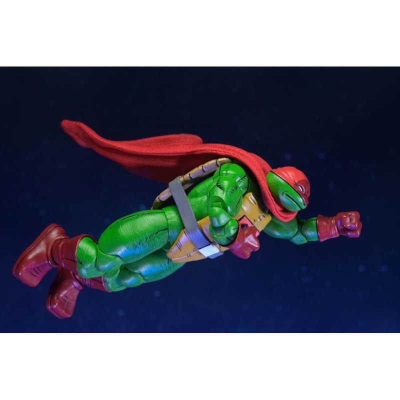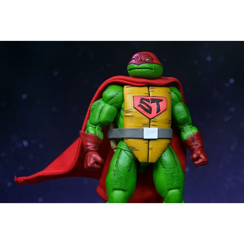 Descubre la impresionante figura articulada de Super Turtle de 18 cm, inspirada en las Teenage Mutant Ninja Turtles de Mirage Comics. Esta figura detallada viene con una capa roja, un cinturón gris y botas rojas que complementan su icónico traje amarillo con el logotipo 'ST'.