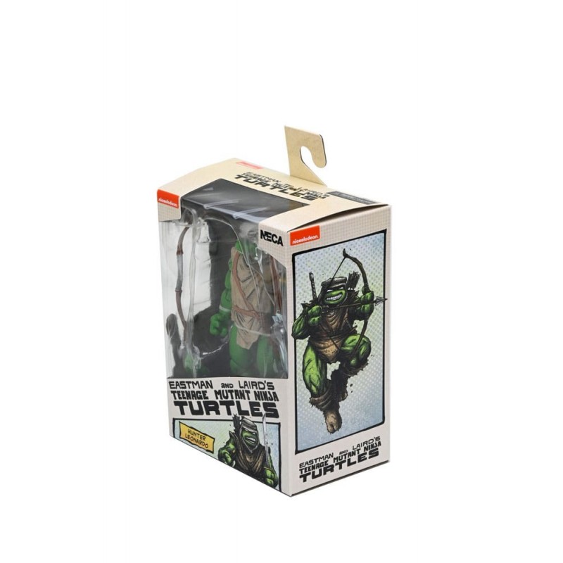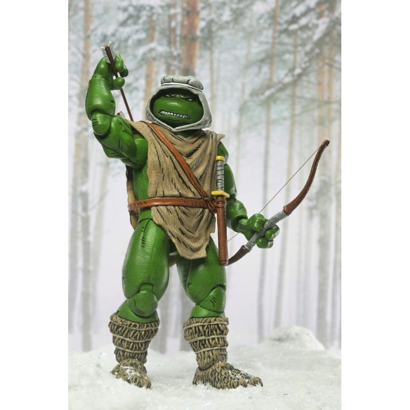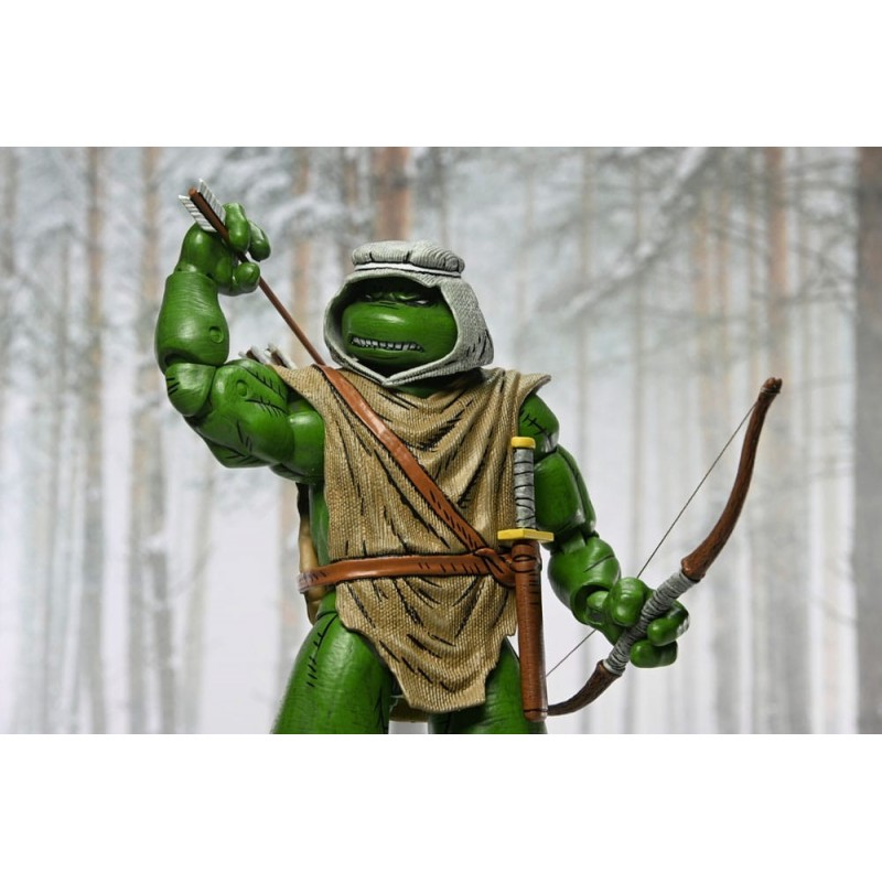 Entre sus accesorios se incluyen un arco y flechas, una espada y manos intercambiables que permiten una personalización detallada para recrear escenas de acción. La figura viene en una caja con ventana, ideal para exhibir o regalar a los amantes de los Teenage Mutant Ninja Turtles. La calidad del material y el diseño hacen de esta figura una joya en cualquier colección.