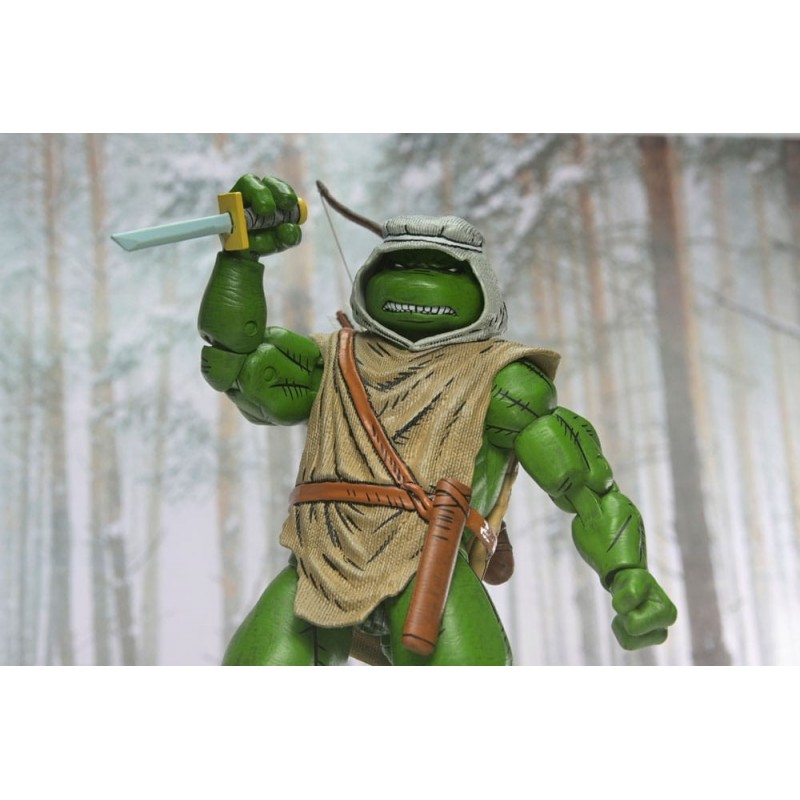 La figura articulada de Hunter Leo de las Tortugas Ninja es un artículo imprescindible para los coleccionistas y fanáticos de estos icónicos personajes. Con un tamaño de aproximadamente 18 cm, esta figura está cuidadosamente diseñada con un nivel de detalle impresionante. Fabricada por NECA, esta pieza oficial con licencia captura a Leonardo en su versión cazador, equipado con una túnica rústica y detalles de combate.