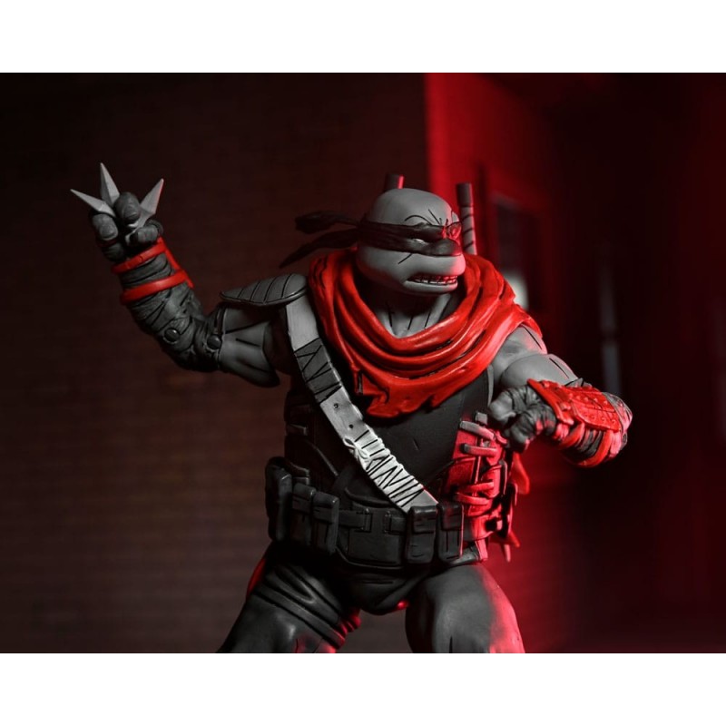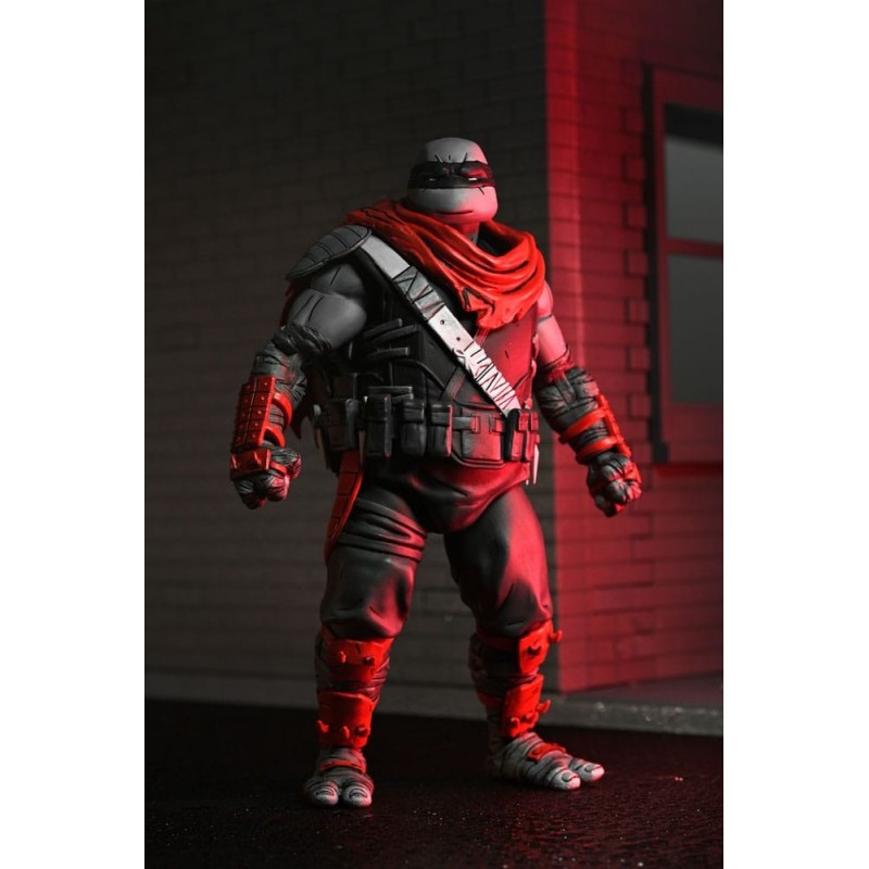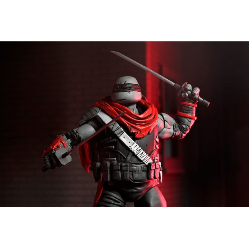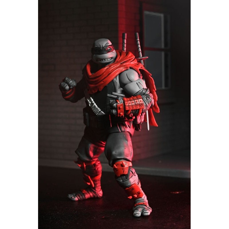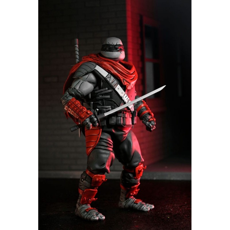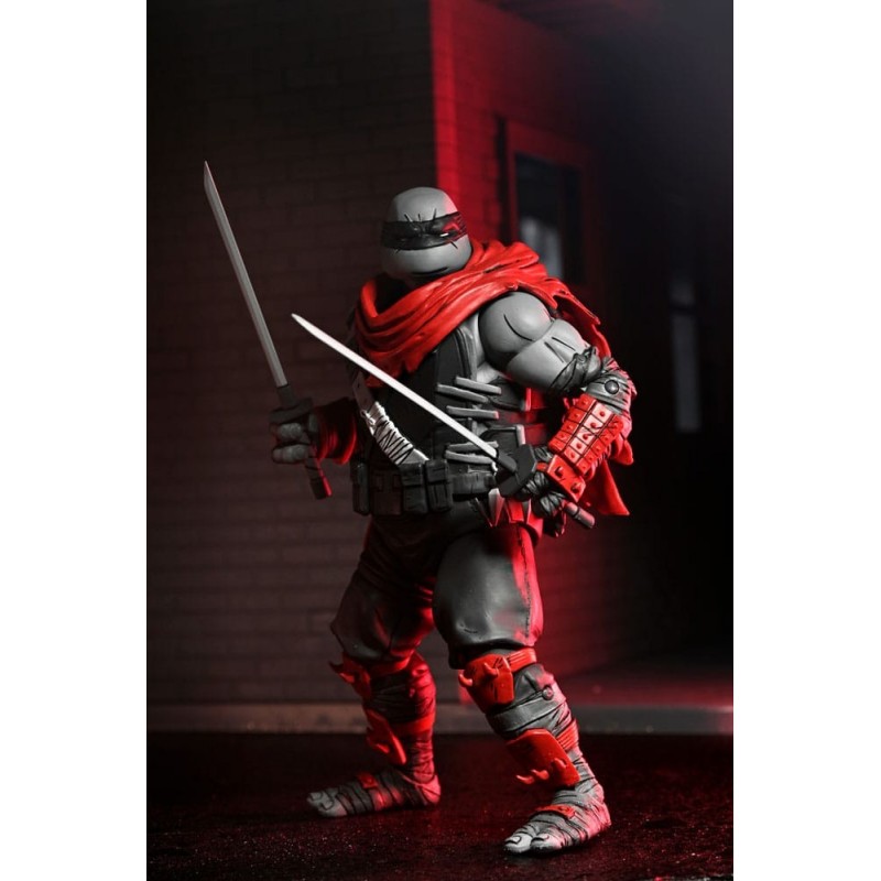Descubre la figura articulada de Leonardo Nightwatcher, inspirada en The Last Ronin: The Lost Years de las Teenage Mutant Ninja Turtles. Esta pieza de coleccionista mide aproximadamente 18 cm y está fabricada por NECA, un líder en figuras de acción. Su diseño detallado incluye un esquema de colores oscuros con acentos rojos, una bufanda y una máscara, proporcionando un aspecto imponente y misterioso.