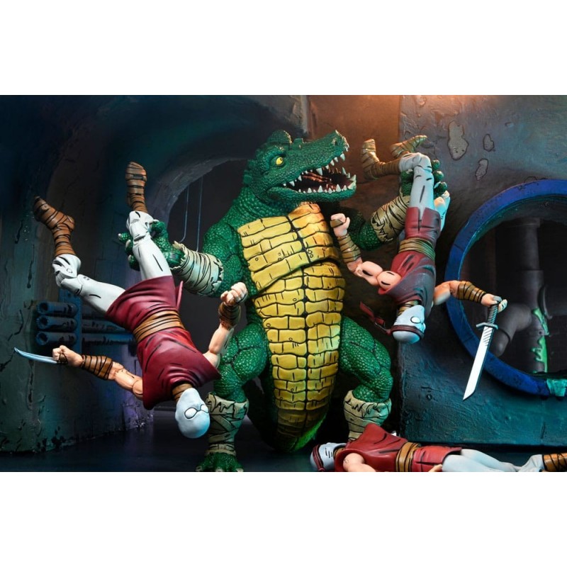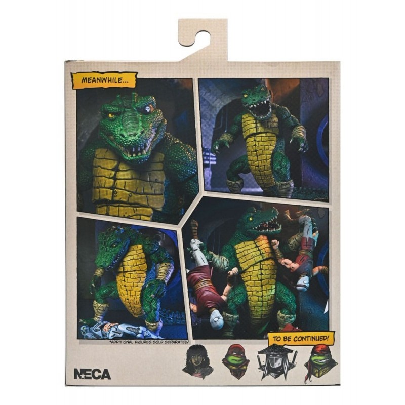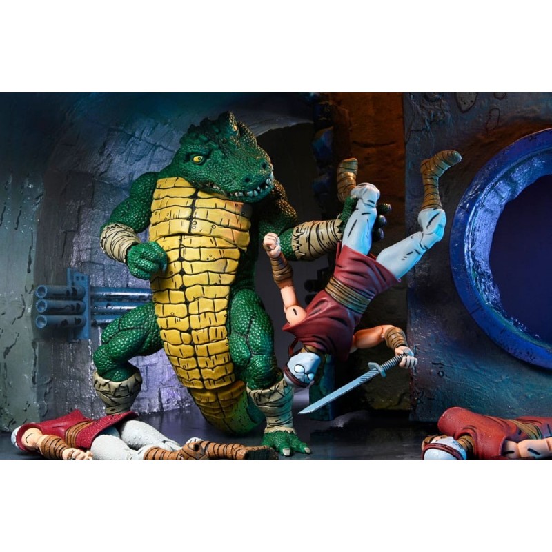 Descubre esta impresionante figura de Leatherhead, inspirada en los icónicos Mirage Comics de las Tortugas Ninja. Con un tamaño de aproximadamente 21 cm, esta figura articulada captura a la perfección los detalles y la esencia del personaje. Fabricada por NECA, esta figura está diseñada con gran precisión, mostrando una combinación de verdes intensos en el cuerpo del caimán y un amarillo vibrante en su vientre. Los detalles de las vendas en brazos y piernas hacen de esta figura un coleccionable excepcional.