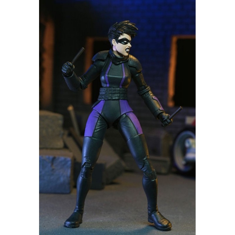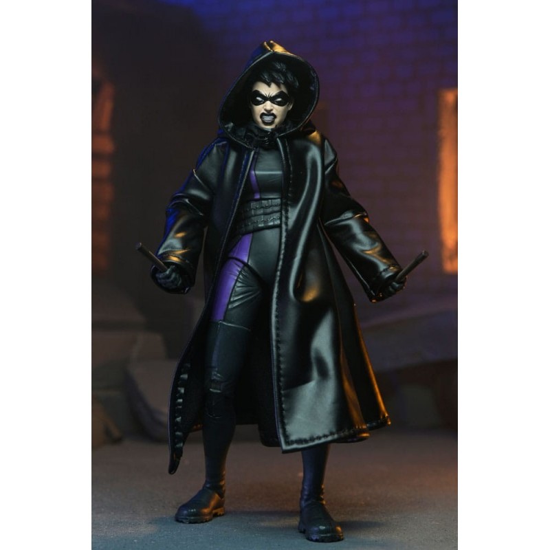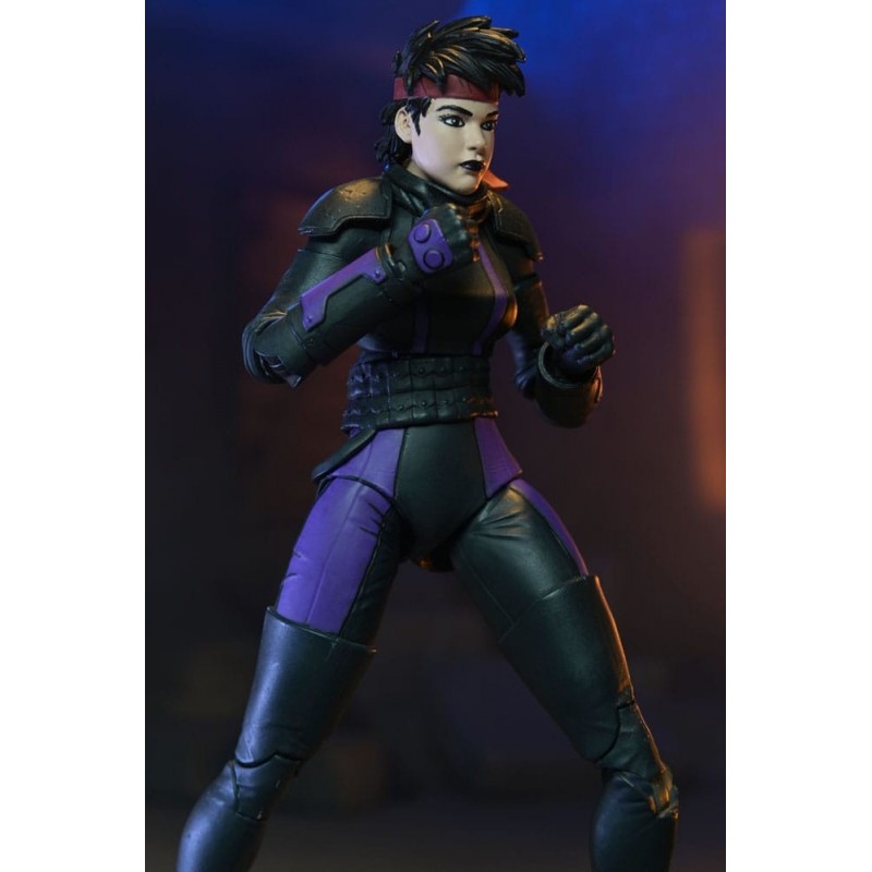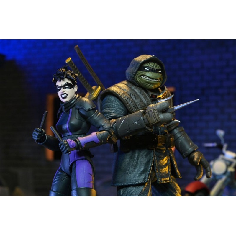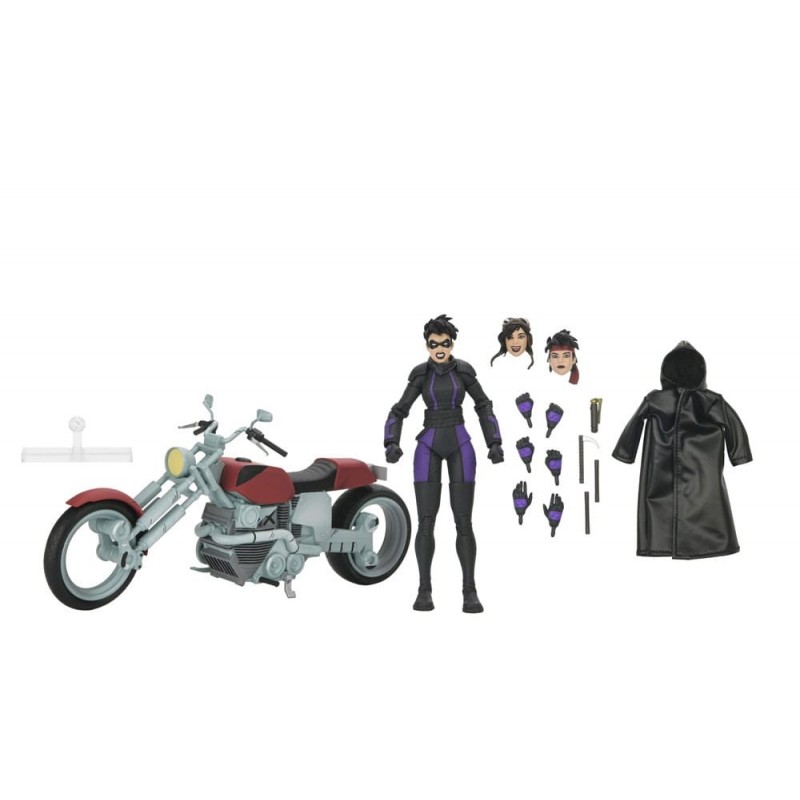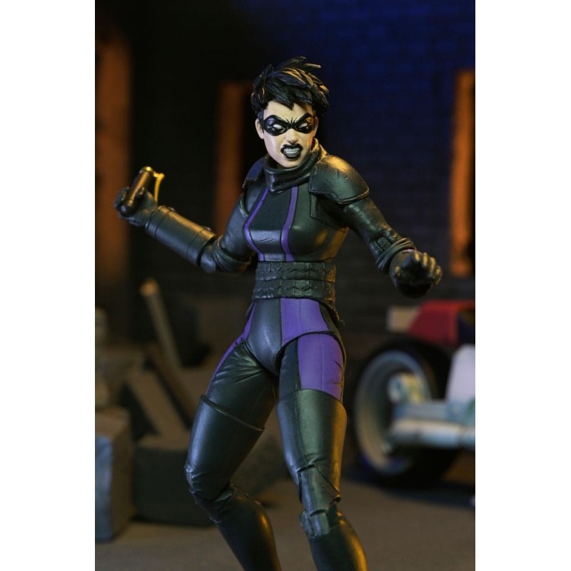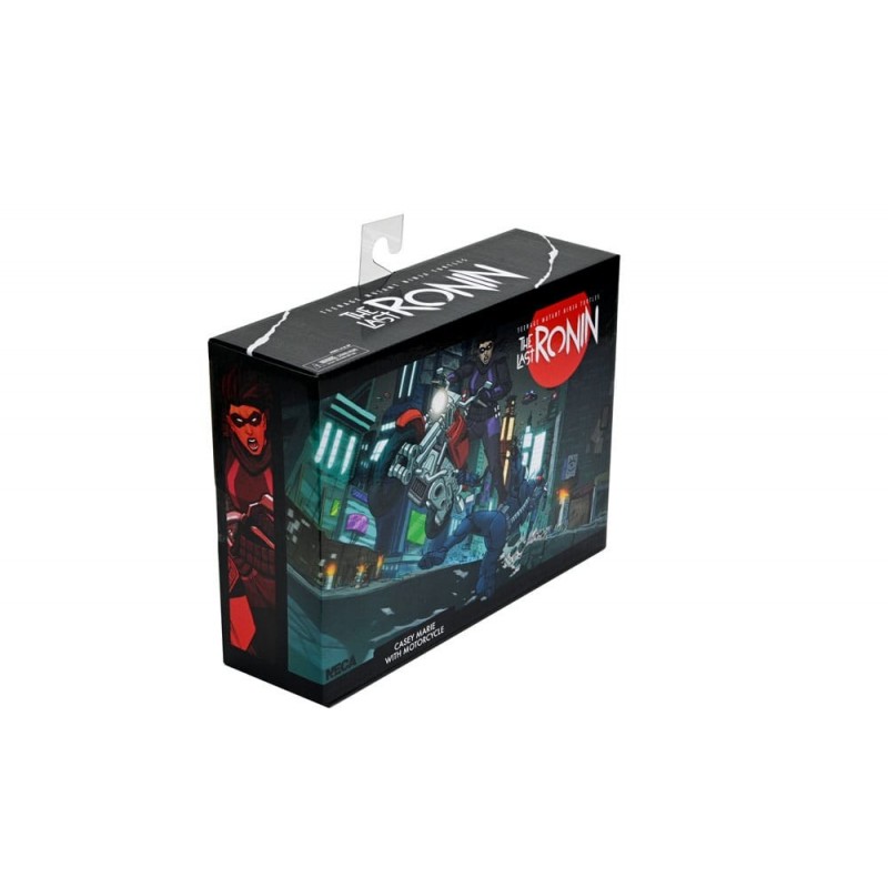 La figura articulada de Casey Marie de 18 cm se destaca por su impresionante diseño y detalles realistas. El set incluye la icónica motocicleta del Last Ronin, pintada en tonos rojos y grises, haciendo perfecta armonía con el traje negro y púrpura de Casey. Fabricada por NECA, esta figura viene acompañada de accesorios intercambiables, como manos y cabezas adicionales, y una capa negra que añade versatilidad para recrear tus escenas favoritas.