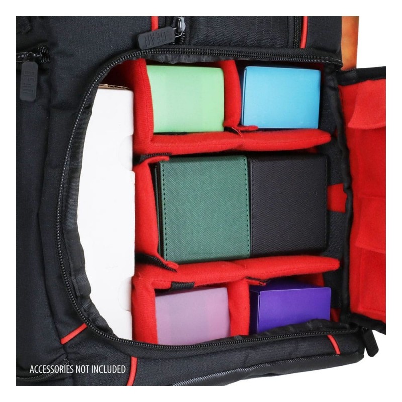 Con múltiples compartimentos acolchados en un vibrante color rojo, es perfecta para organizar cajas de cartas, dados y otros elementos esenciales del juego. La mochila mide aproximadamente 11 pulgadas de alto y 10.5 pulgadas de ancho, ofreciendo un amplio espacio de almacenamiento.