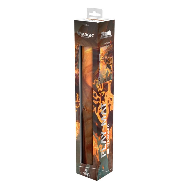Descubre el tapete de juego de alta calidad de Ultimate Guard, diseñado especialmente para los fanáticos de Magic: The Gathering. Con un impresionante diseño de Tarkir: Dragonstorm, este tapete muestra una obra de arte vibrante en tonos naranja y marrón, destacando a un personaje en medio de llamas mágicas.