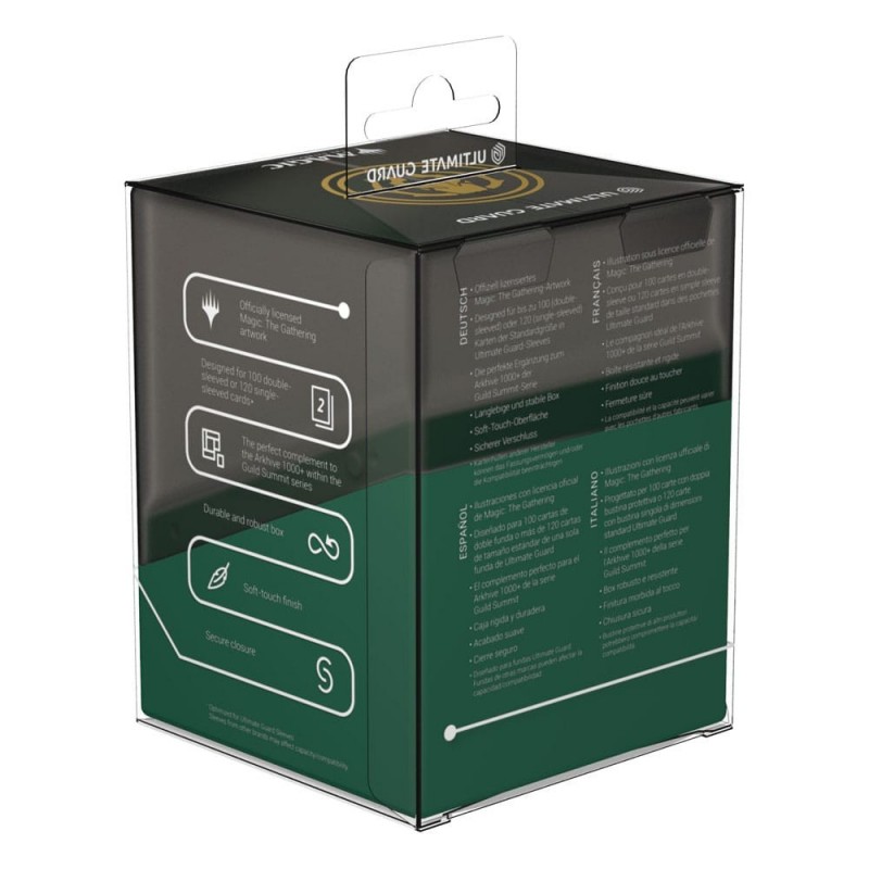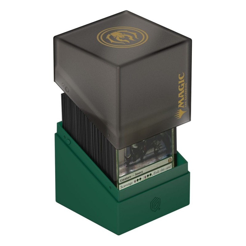 Adéntrate en el mundo de Magic: The Gathering con la exclusiva caja Boulder 100+ de Ultimate Guard, dedicada al gremio Golgari. Este elegante almacenador presenta una tapa semitransparente con un acabado sedoso y un escudo dorado que destaca el emblema del gremio. Diseñada para proteger y organizar hasta 100 cartas enfundadas, es el accesorio perfecto para tus mazos Commander bicolor. No solo es robusta y de diseño sofisticado, sino que también complementa perfectamente la serie "Guild Summit".
