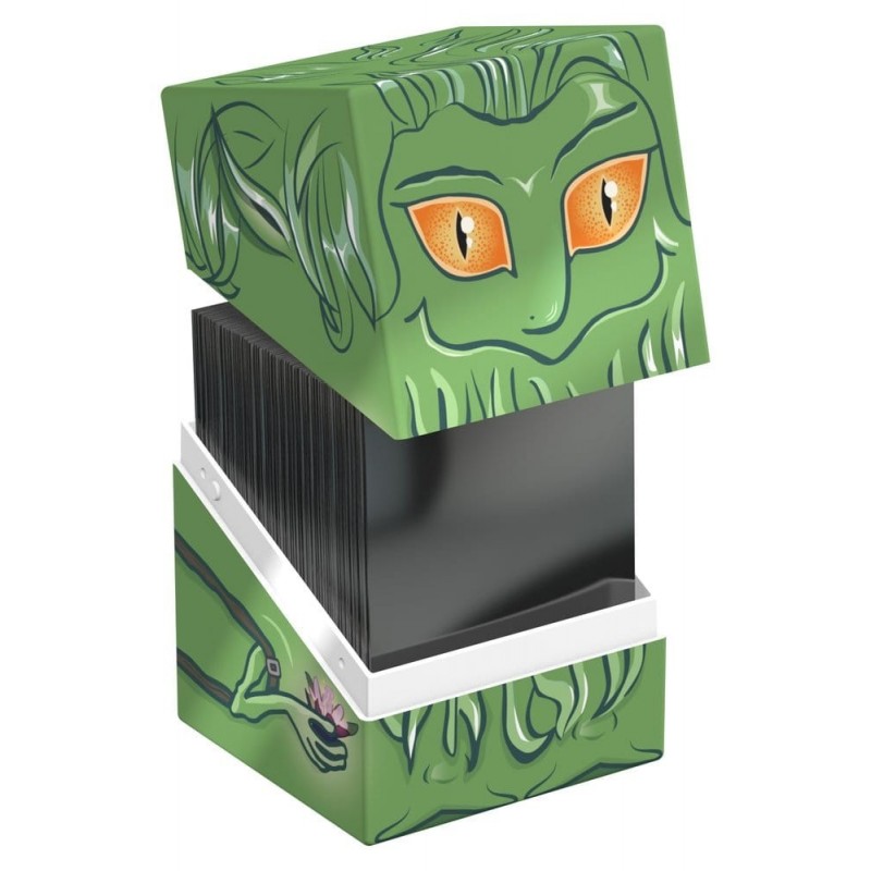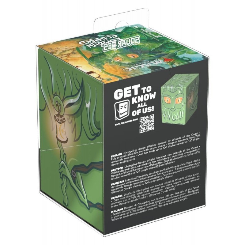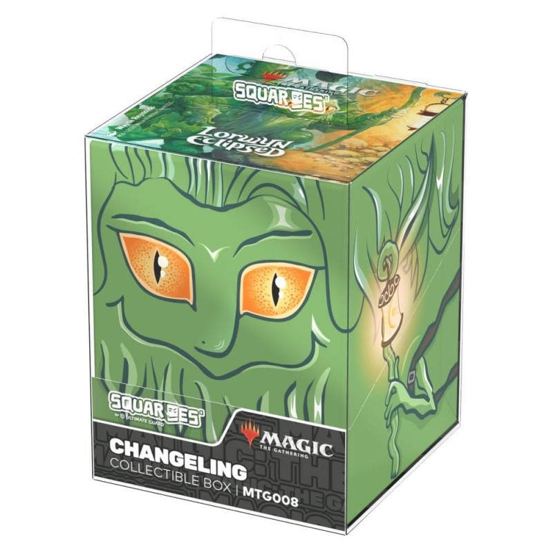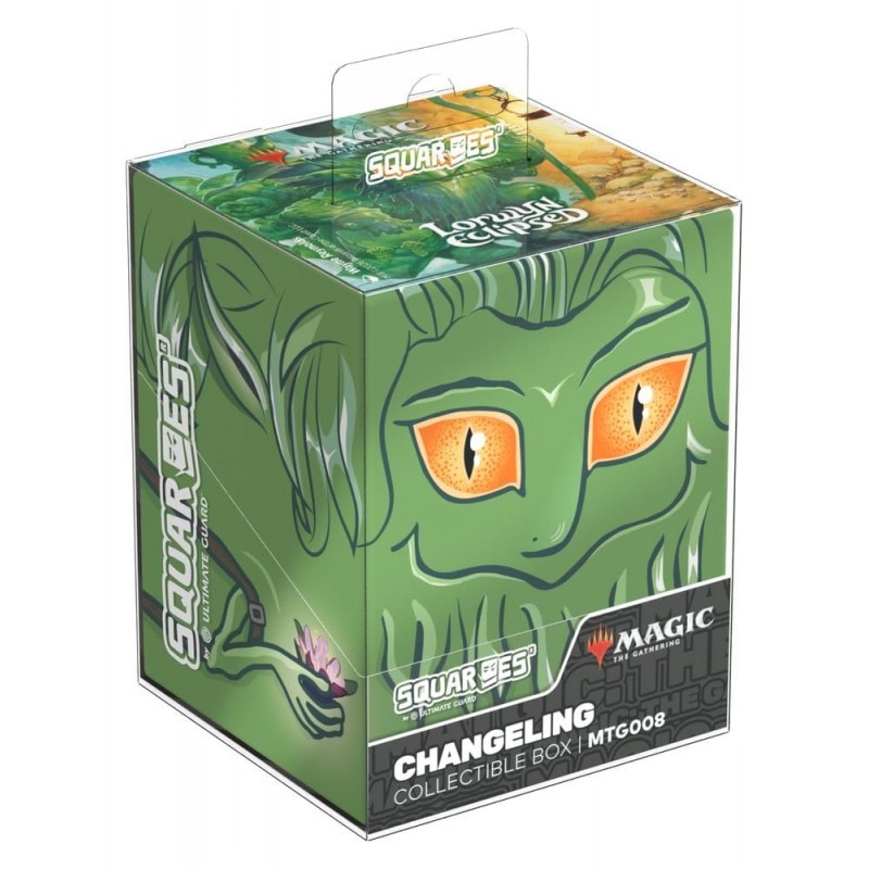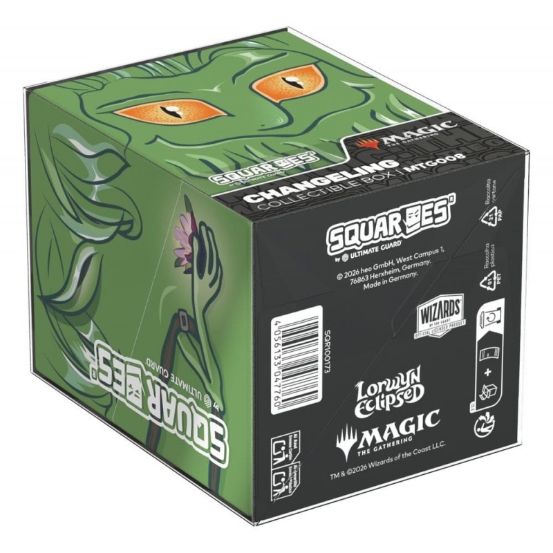 La Caja Coleccionable Changeling Squaroes de la serie "Lorwyn Eclipsed" para Magic: The Gathering es el complemento perfecto para los aficionados a los juegos de cartas y coleccionistas. Presenta un diseño encantador y místico en tonos verdes vibrantes, con un personaje que destaca por sus llamativos ojos naranjas y detalles florales. Fabricada en Alemania, esta caja está elaborada con un 78% de recursos renovables, destacando su compromiso con el medio ambiente.