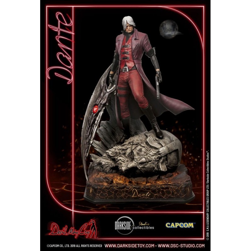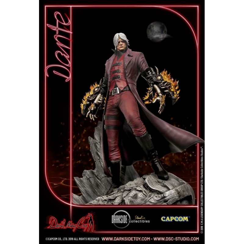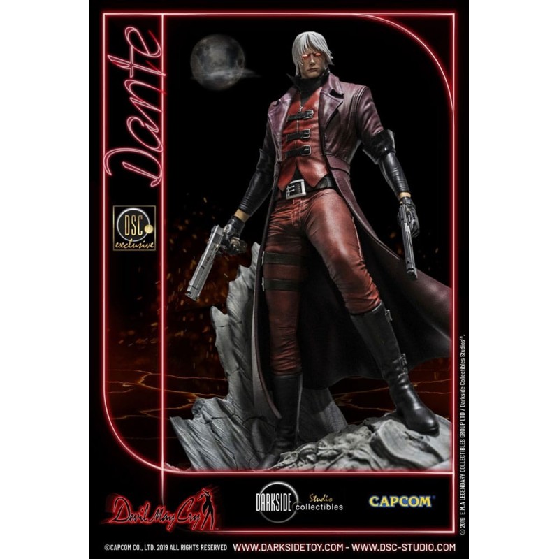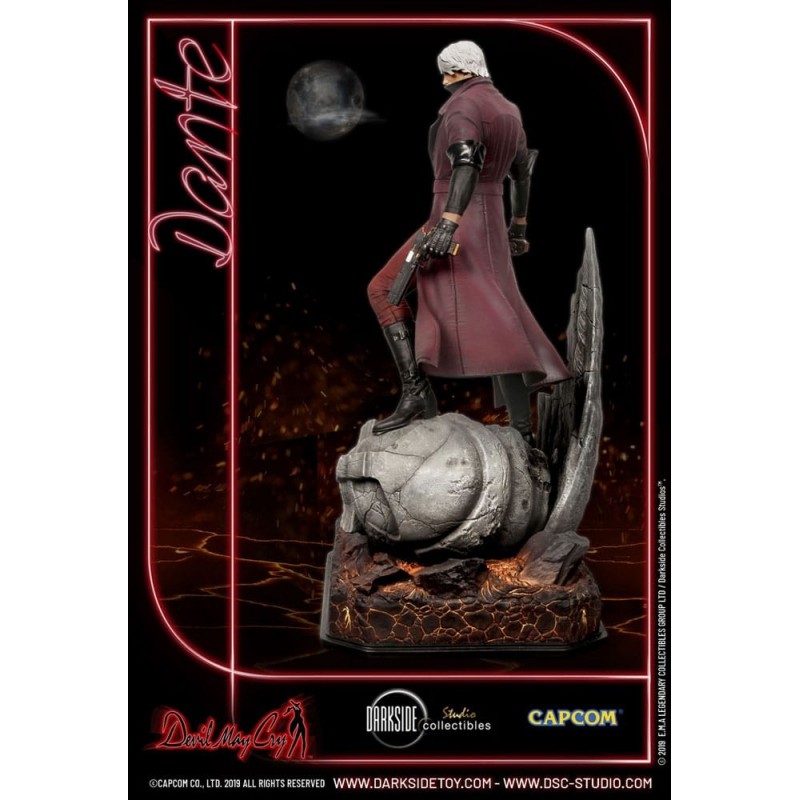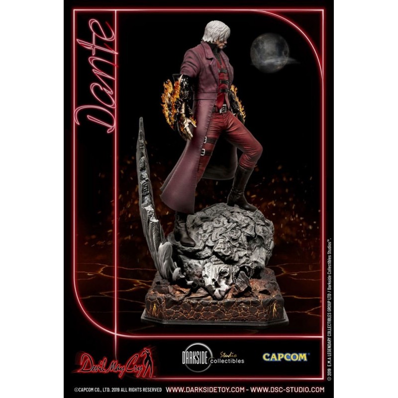 Vestido en su característico abrigo rojo, Dante se encuentra sobre una base detallada que simula un terreno rocoso, preparado para enfrentar cualquier desafío. La figura incluye detalles exclusivos, como su cabello plateado y sus ojos rojos penetrantes, que destacan su presencia imponente.