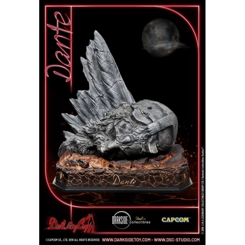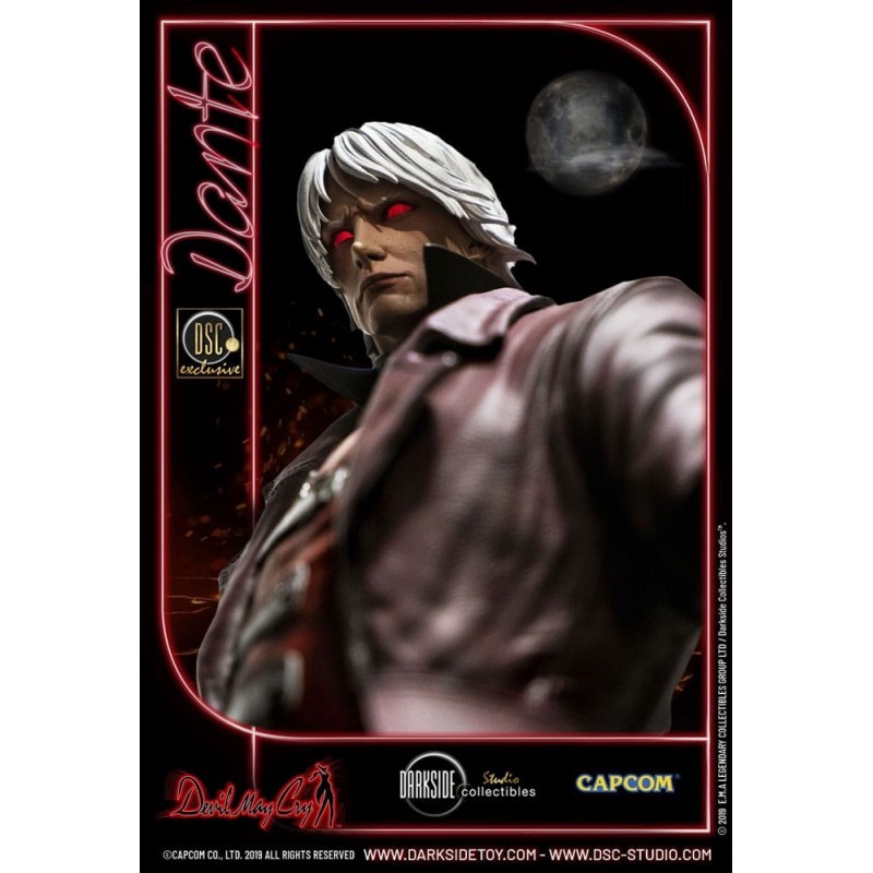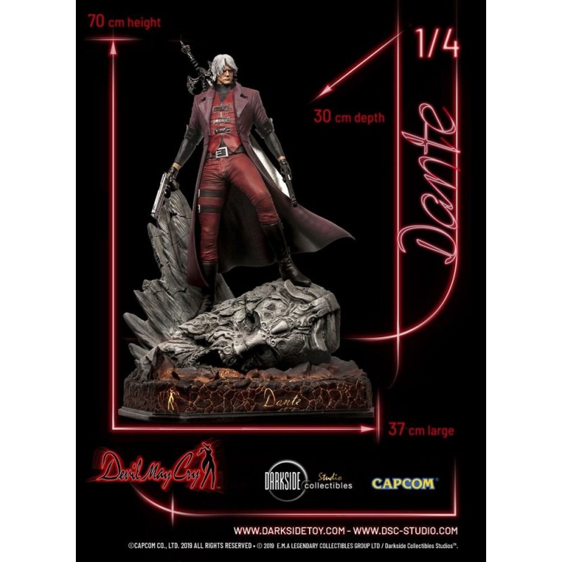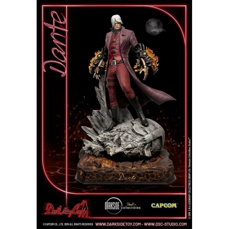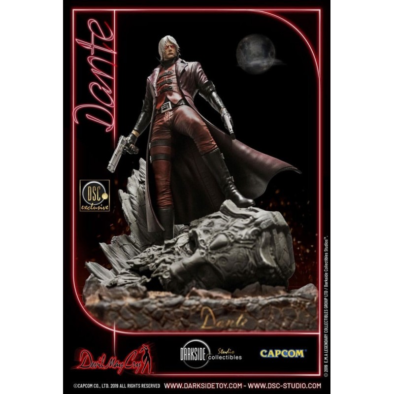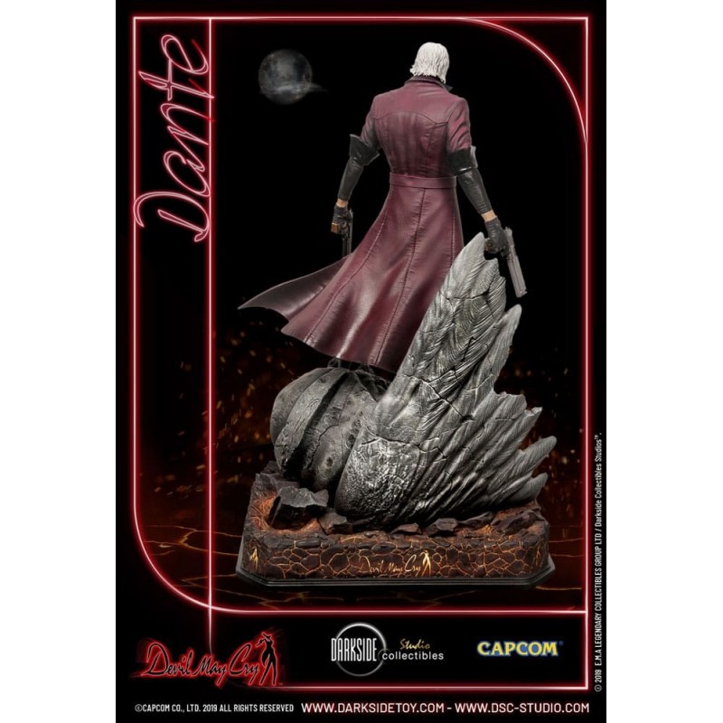 Vestido en su característico abrigo rojo, Dante se encuentra sobre una base detallada que simula un terreno rocoso, preparado para enfrentar cualquier desafío. La figura incluye detalles exclusivos, como su cabello plateado y sus ojos rojos penetrantes, que destacan su presencia imponente.