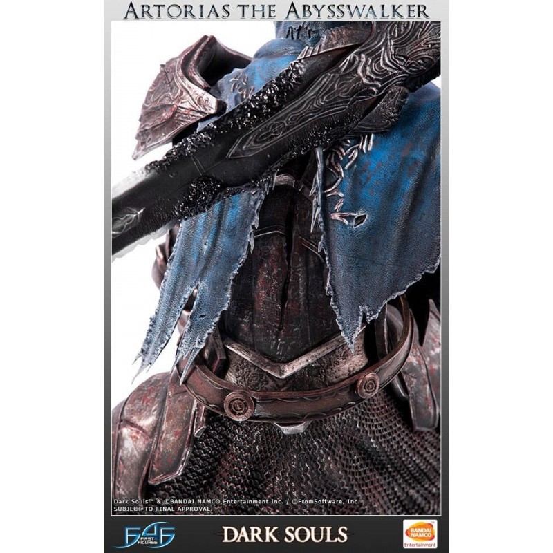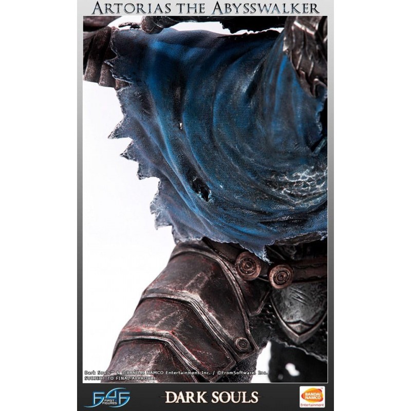 Artorias se presenta en una dinámica pose de batalla, armado con su gran espada mientras su capa azul ondea en movimiento. La detallada armadura y la base texturizada enfatizan la calidad artesanal del producto.