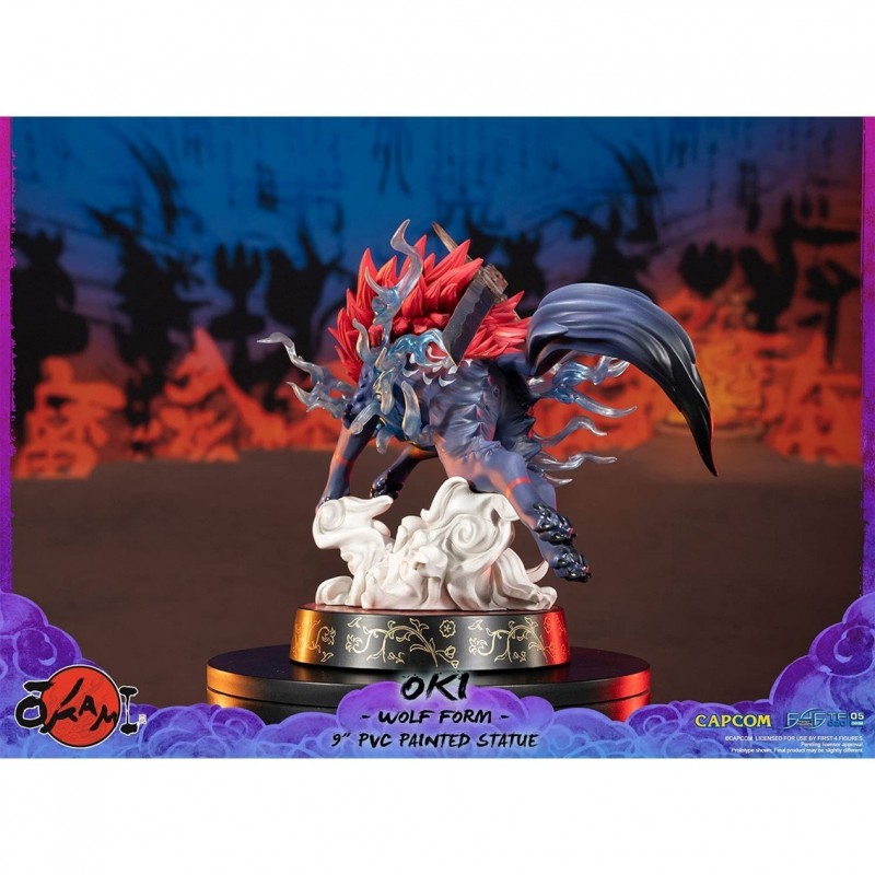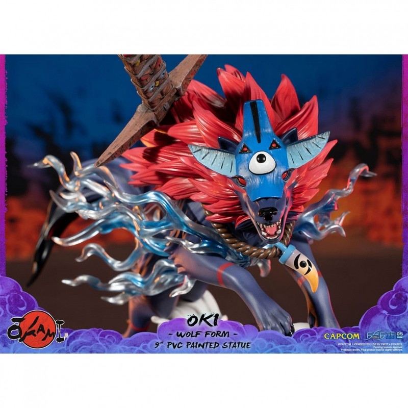 Descubre la impresionante figura de Oki en Forma de Lobo, una pieza exclusiva de First 4 Figures inspirada en el universo de Okami. Oki, el valiente guerrero de la tribu Oina, se presenta en su majestuosa forma de lobo, con un aura azul que emana de su pecho, simbolizando su poder y determinación. El dinamismo de esta estatua se realza con una nube de humo en la base, simulando un salto feroz hacia la batalla.