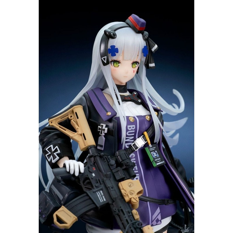 La estatua muestra a 416MOD3 con su característico atuendo y armamento, en un esquema de colores predominantes negros y violetas. El cabello largo y plateado añade un toque de dinamismo, mientras que los detalles en sus armas y accesorios reflejan su imponente presencia en el campo de batalla.