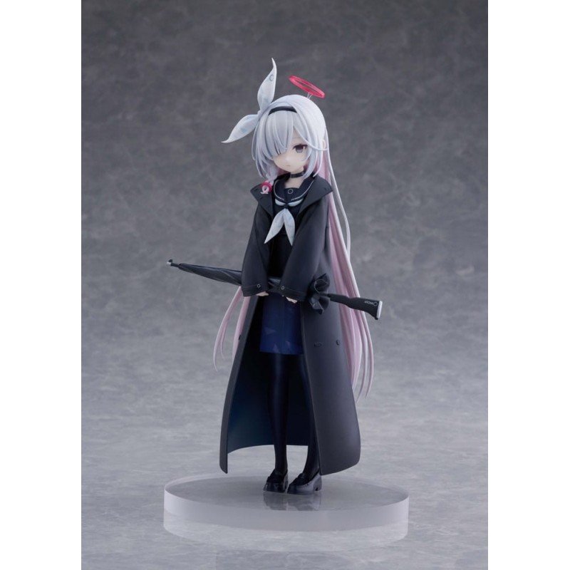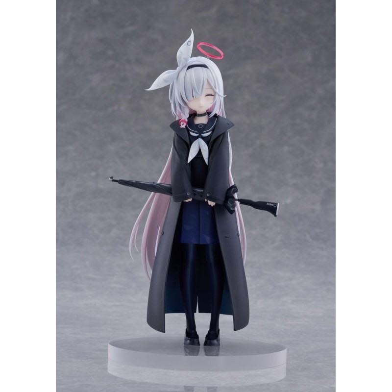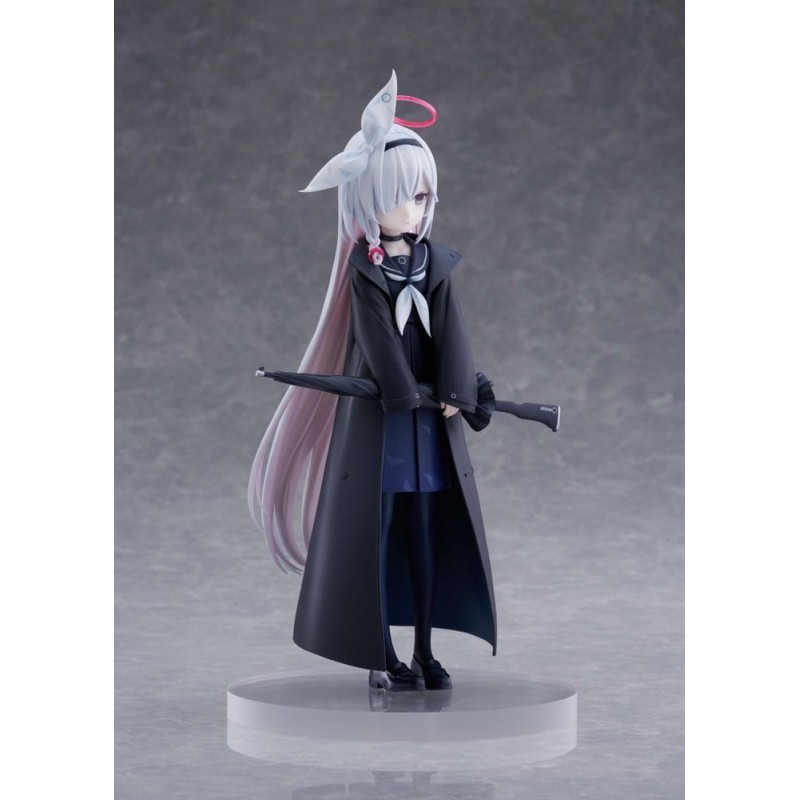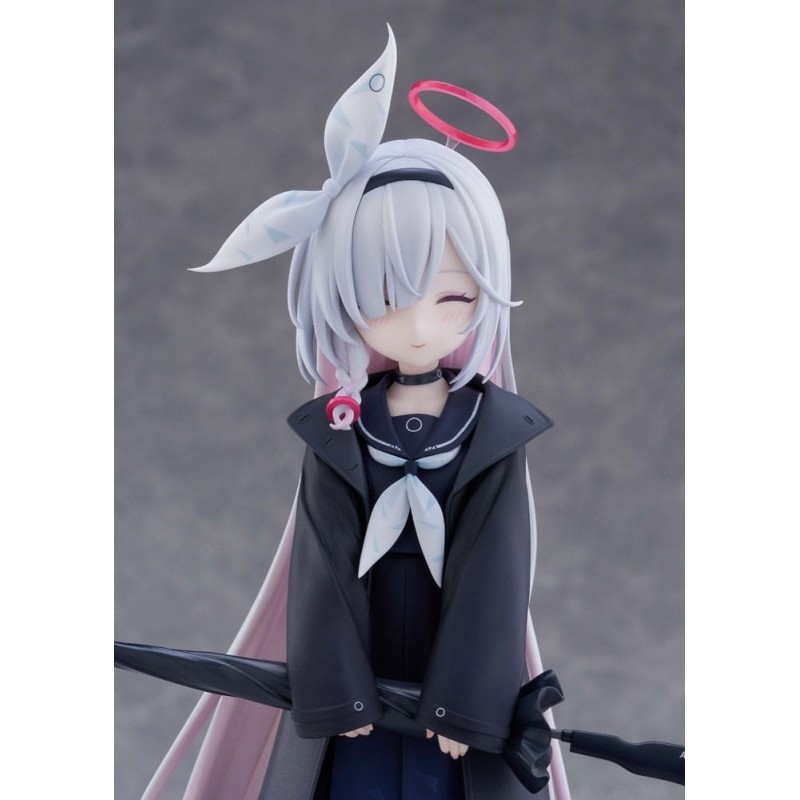 La figura presenta un diseño meticuloso, con un atuendo que incluye un abrigo negro largo, una falda azul oscuro y detalles en blanco que contrastan perfectamente. Su cabello es de un tono blanco con reflejos rosados, y destaca un halo rosa sobre su cabeza, símbolo característico del personaje. Además, sostiene un paraguas negro, añadido que complementa la estética del conjunto.