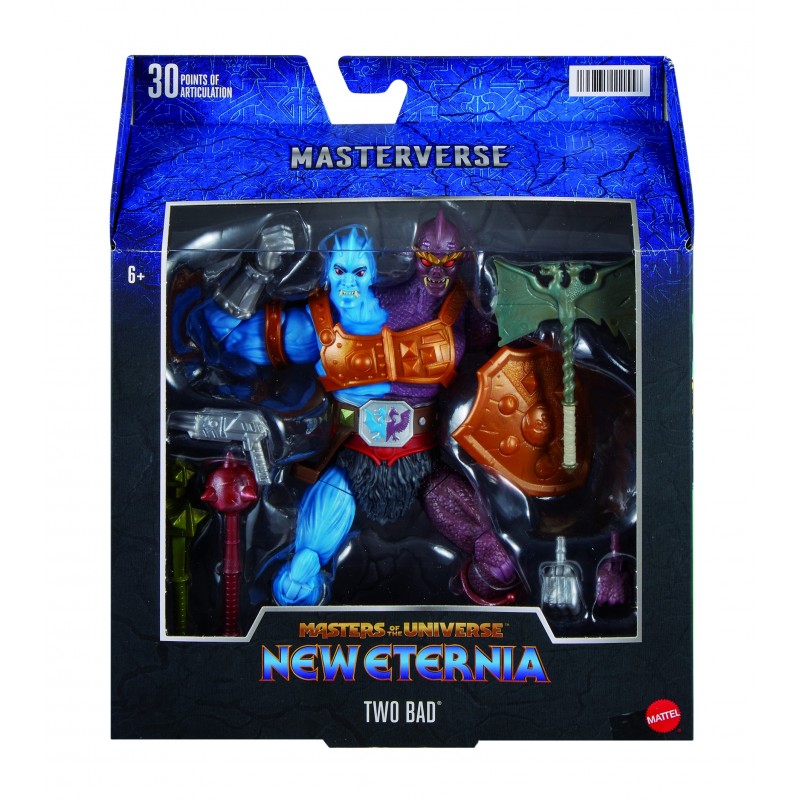 La espectacular figura de acción Two Bad de la serie Masterverse captura al icónico villano de Masters of the Universe con un impresionante tamaño de 20 cm. Esta figura cuenta con un diseño detallado y vívido, combinando colores llamativos como azul y púrpura, resaltando su dualidad.