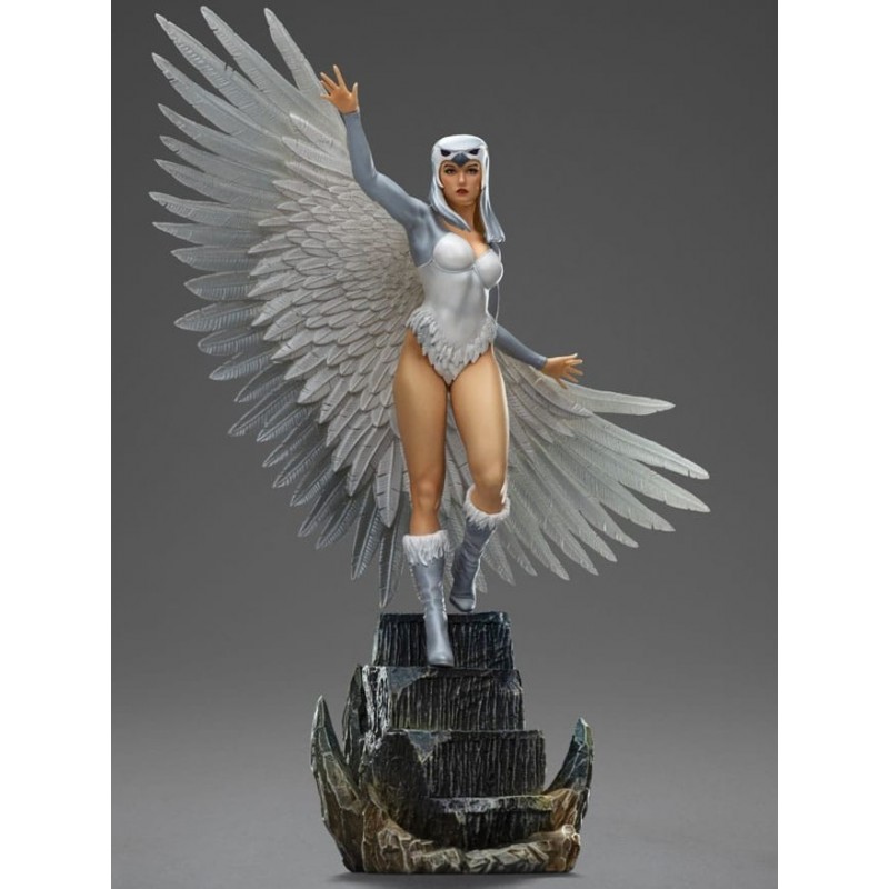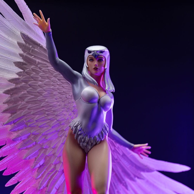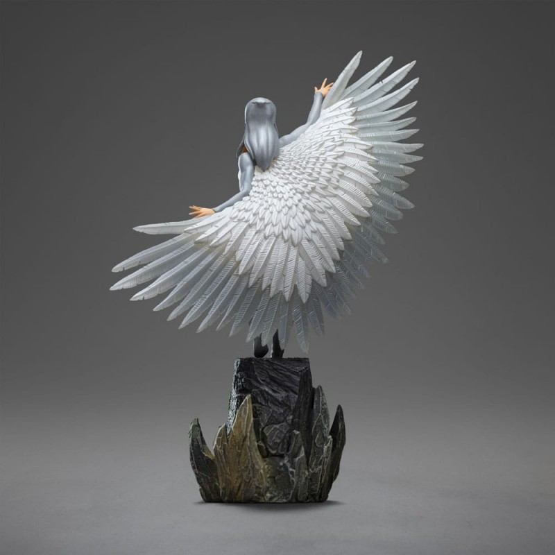 La estatua muestra a White Sorceress con una pose majestuosa, extendiendo sus imponentes alas con un acabado en tonos plateados y blancos, capturando a la perfección el espíritu del personaje. Su atuendo y expresión están meticulosamente detallados, haciendo de esta figura un elemento imprescindible para los fans de la saga.