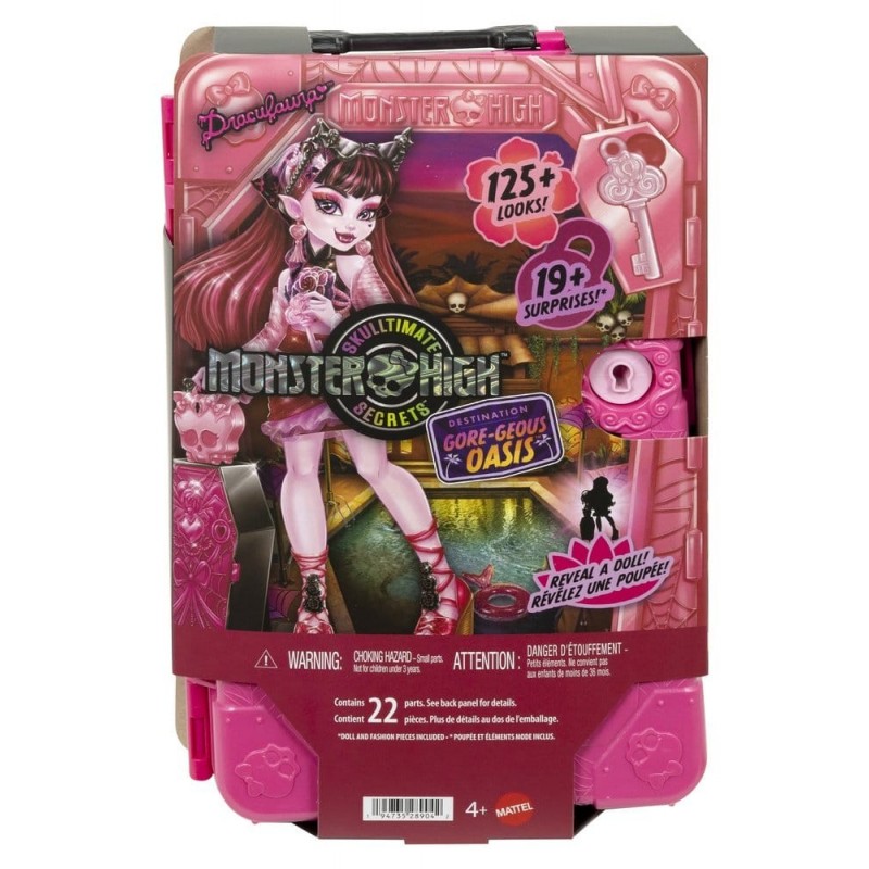 Embárcate en una aventura espeluznantemente divertida con la muñeca Draculaura de Monster High, parte de la colección Skulltimate Secrets: Destination: Gore-geous Oasis. Esta muñeca se presenta con un estilo impactante, luciendo cabello rosa con mechones negros, un top sin mangas y una falda decorada con patrones florales en tonos rosados. Completan su look un par de elegantes botas de tacón alto en color púrpura y detalles como pendientes en forma de corazón.